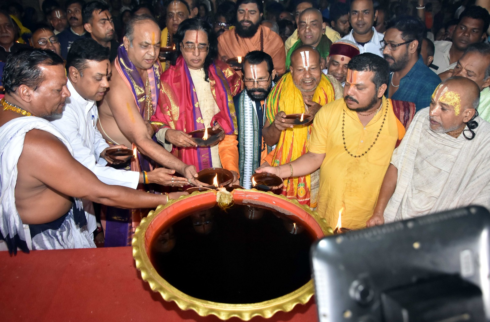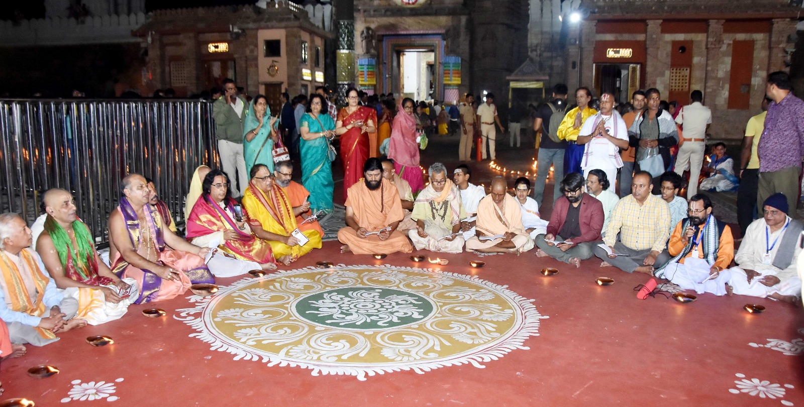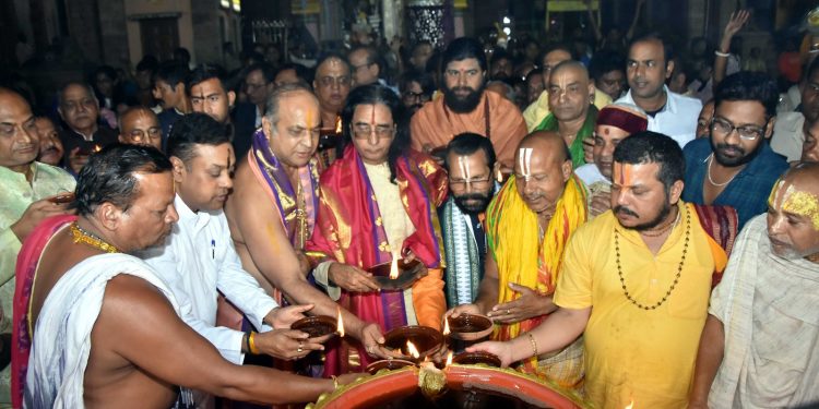 Monastic heads light lamps in front of ‘Singhadwara’ of Puri Jagannath Temple as part of ‘Deba Depabali’ observance
