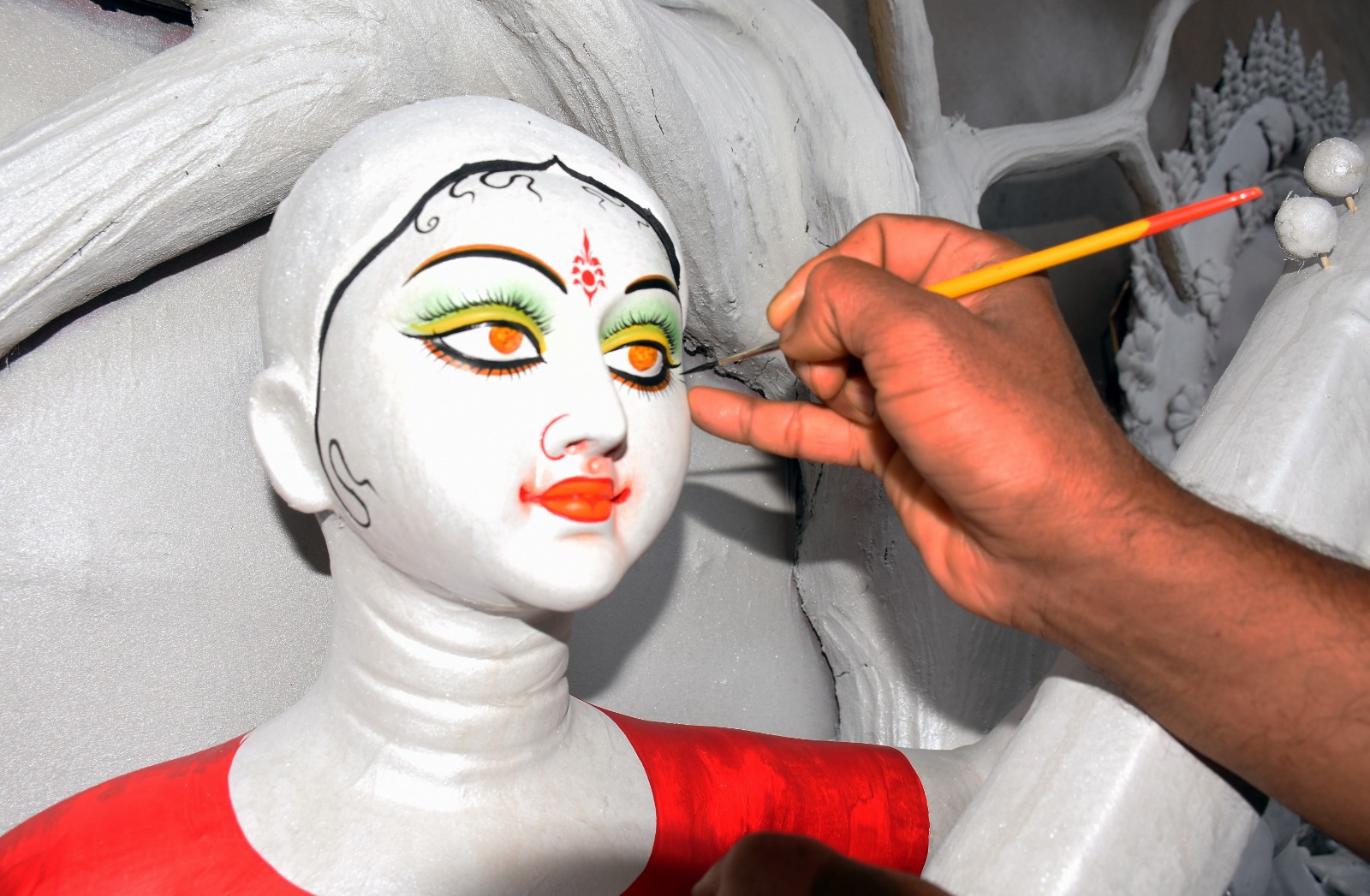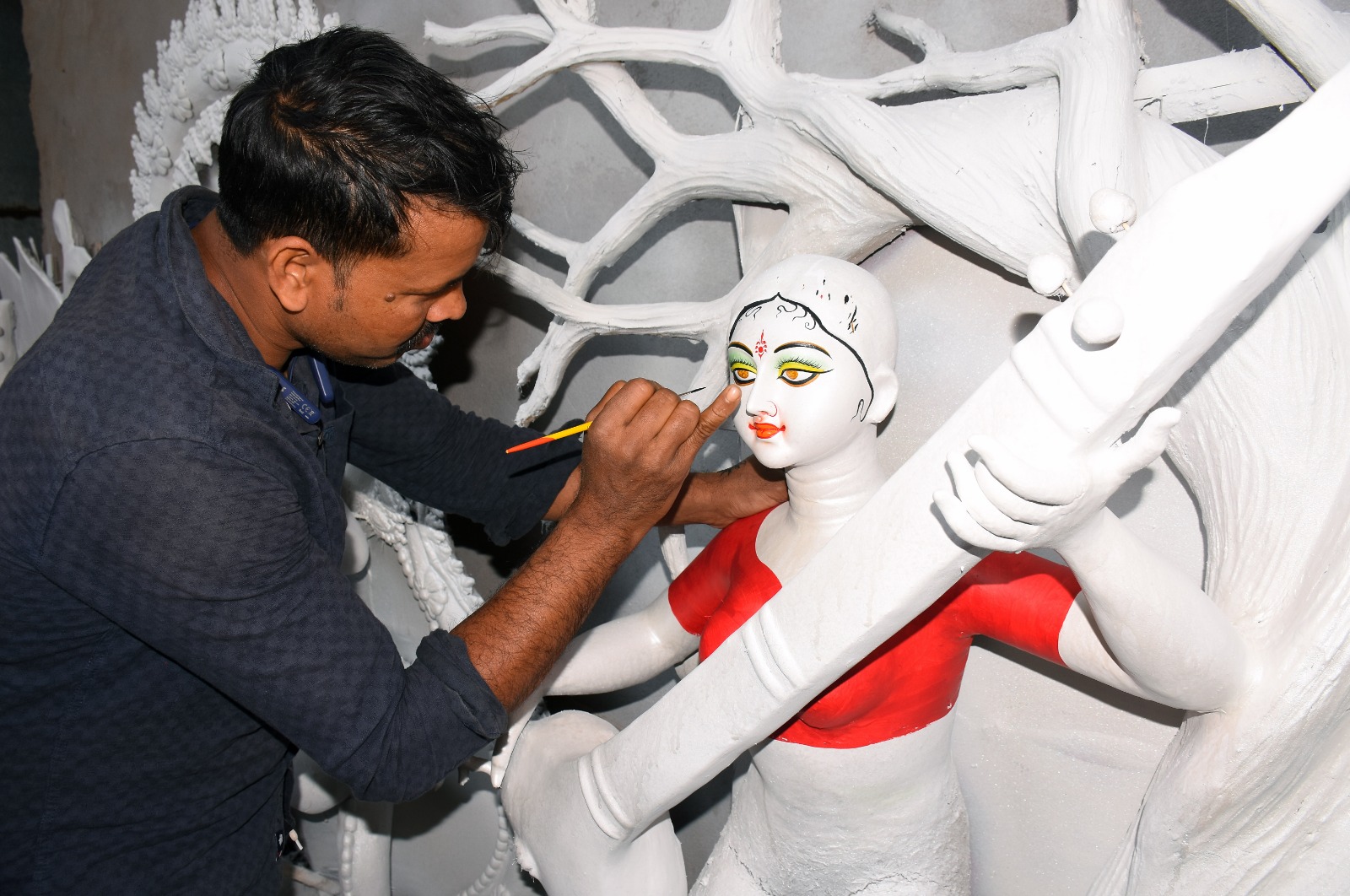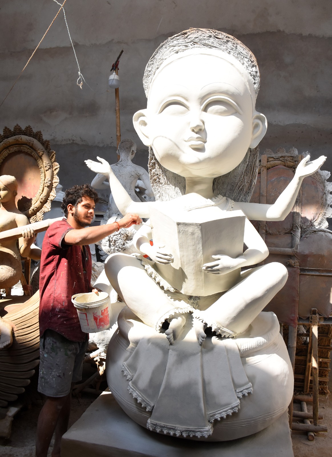 Artisans gives final touches toGoddess Saraswati idol at Nayapalli Durga Puja mandap in Bhubaneswar