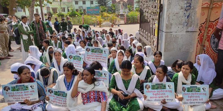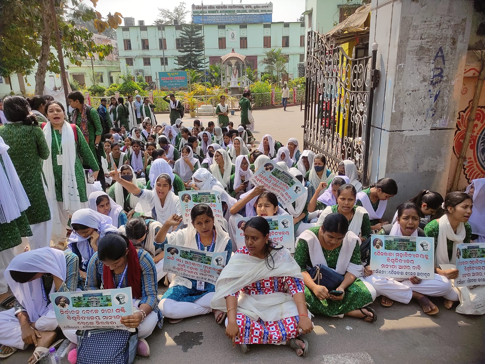 Students of Shailabala Women’s College in Cuttack stage protest demanding university status