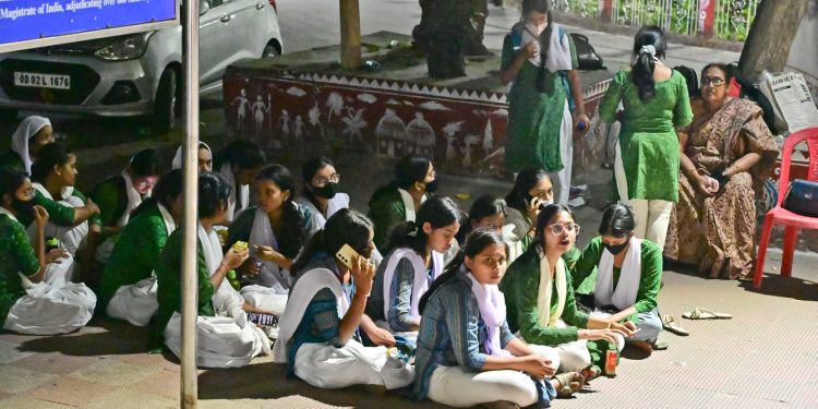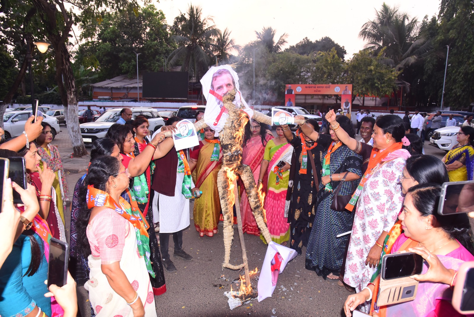 BJP Mahila Morcha members stage demonstration near Ram Mandir, condemning the protest by Youth Congress activists at the AI summit, Bhubaneswar