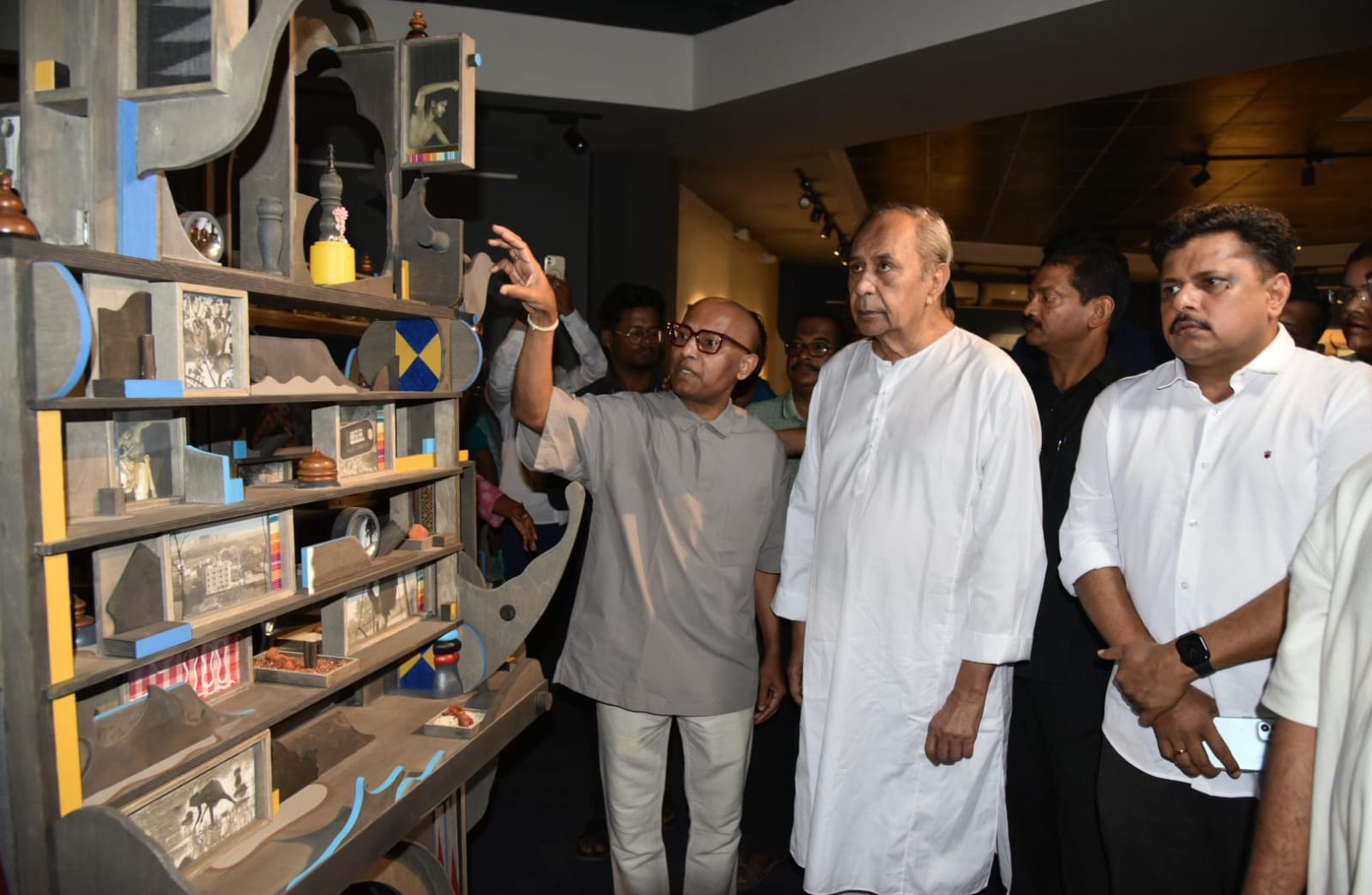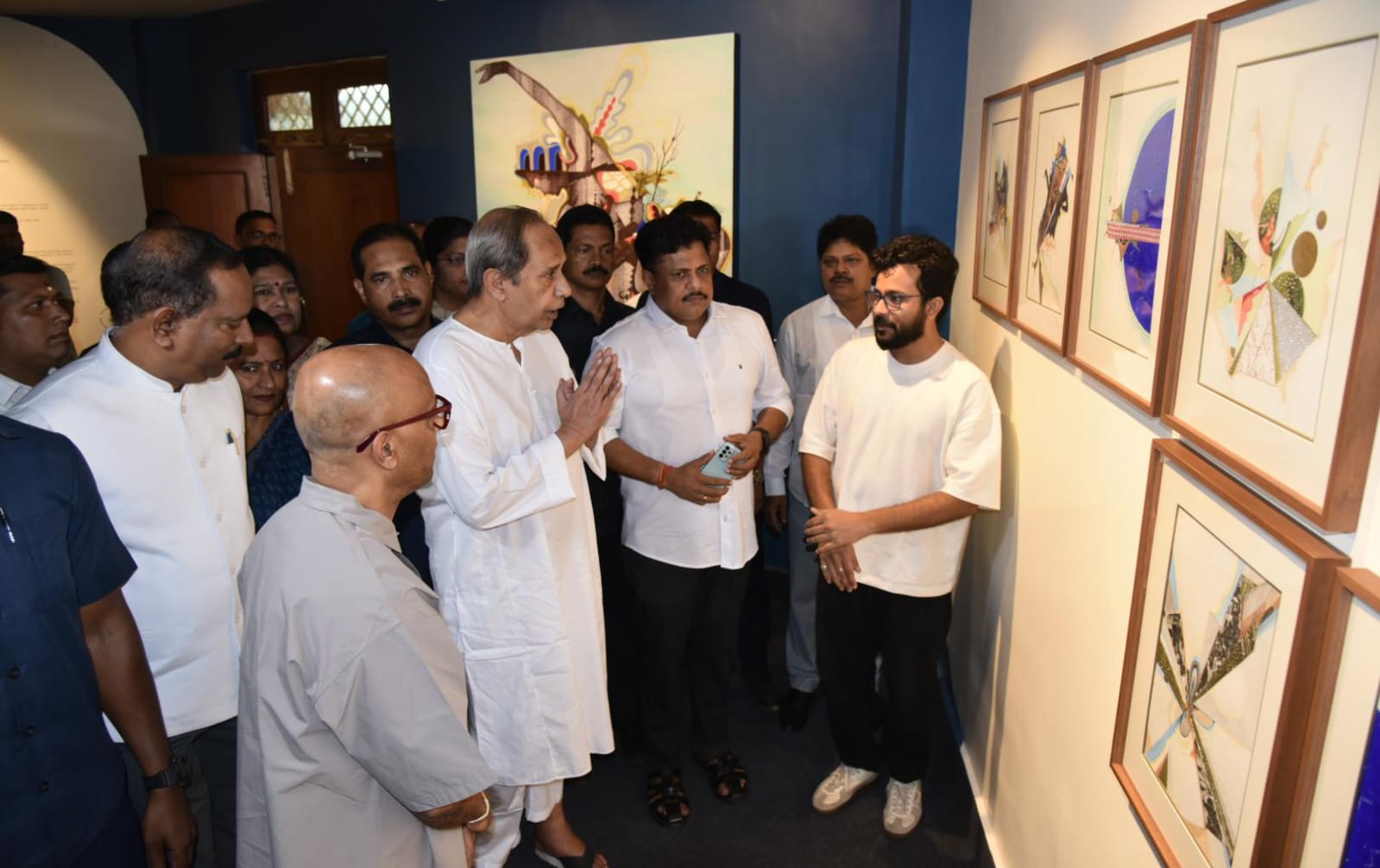 Former Chief Minister and BJD president Naveen Patnaik attends the solo exhibition of contemporary artist Jagannath Panda at the Lalit Kala Akademi Regional Centre Monday