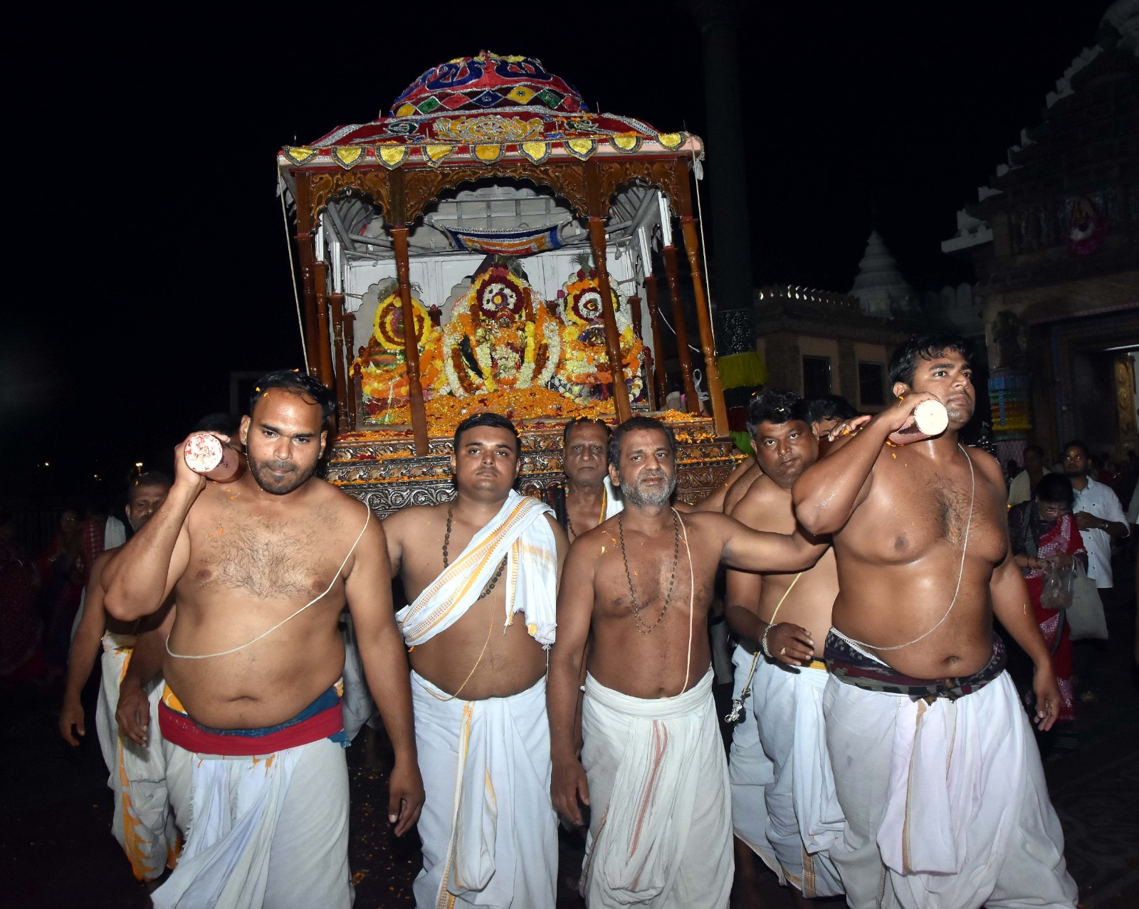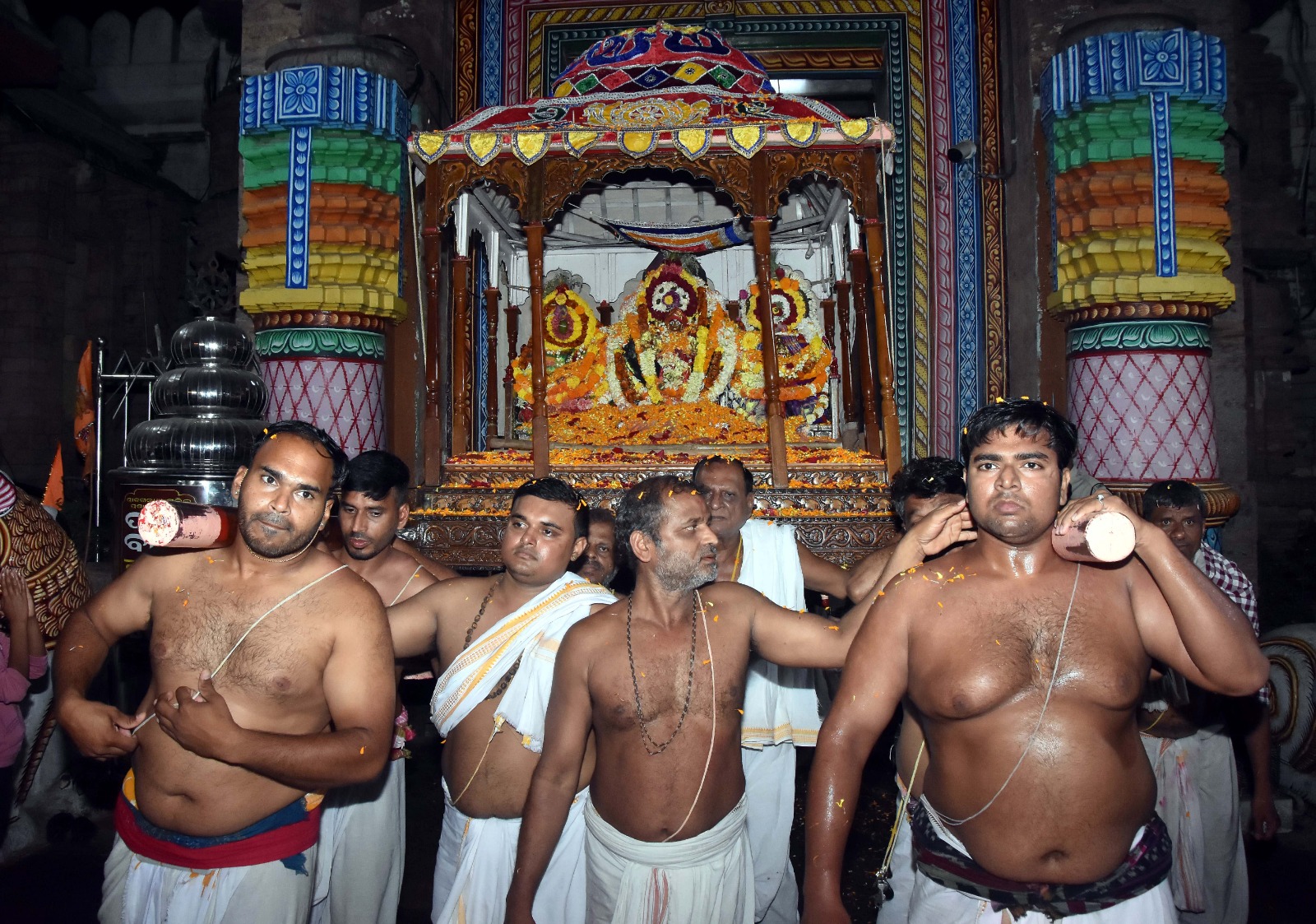 Lord Dolagobinda proceeds for rituals along with goddesses Bhudevi and Sridevi on the occasion of Fagu Dashami