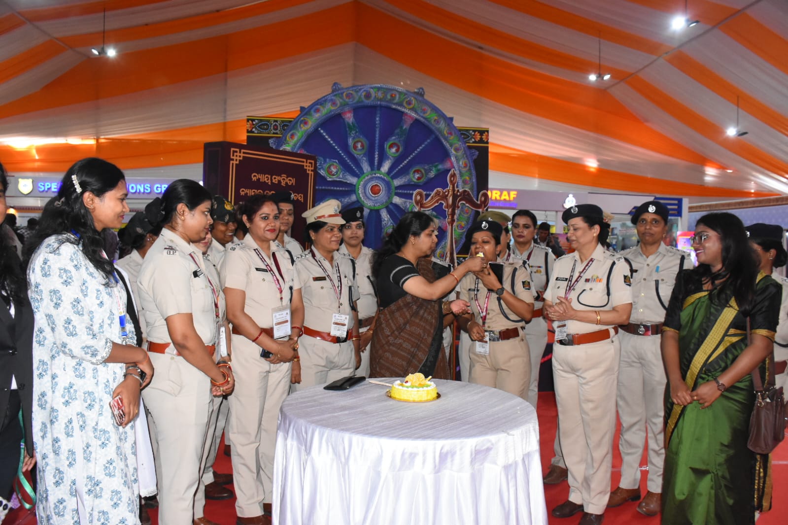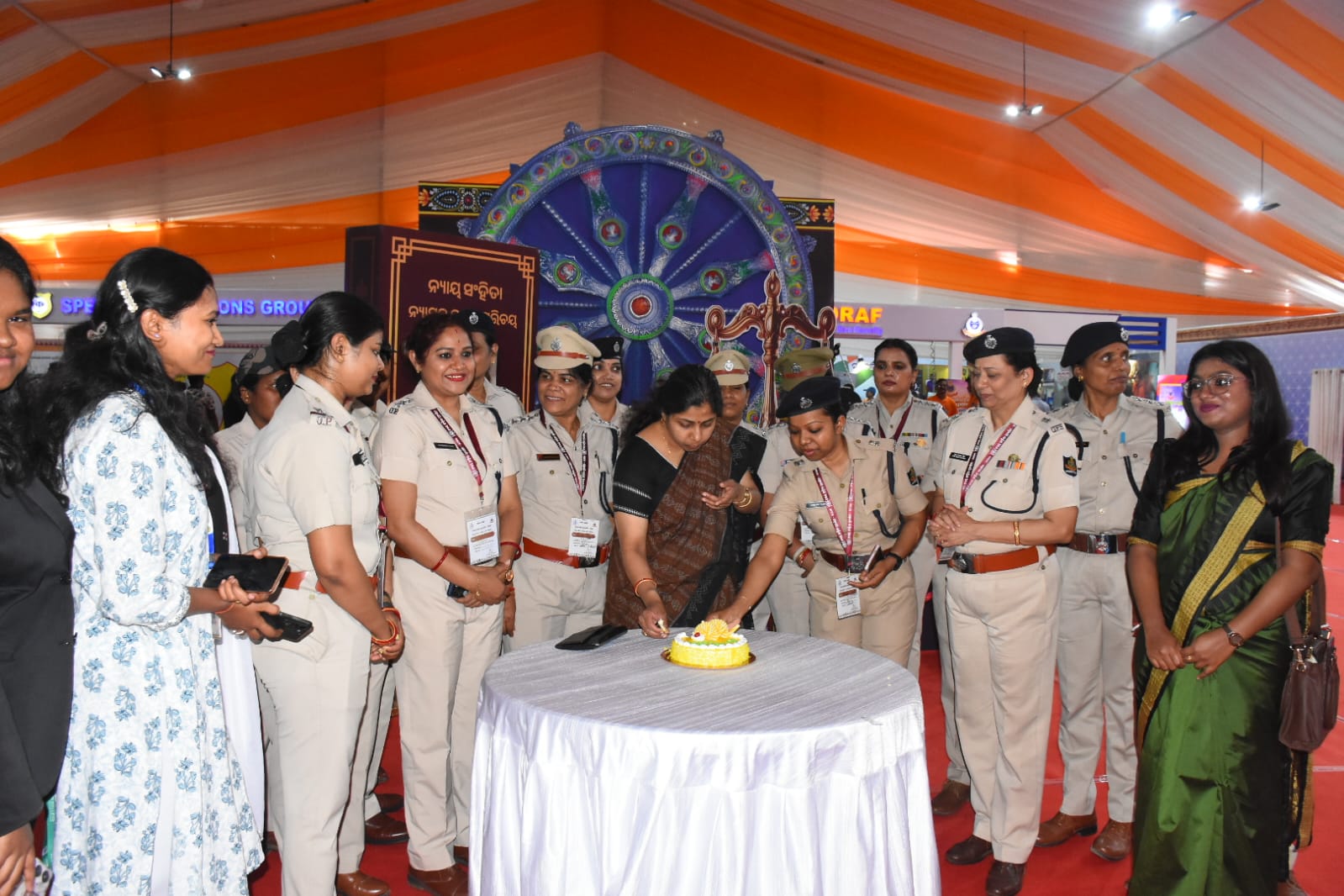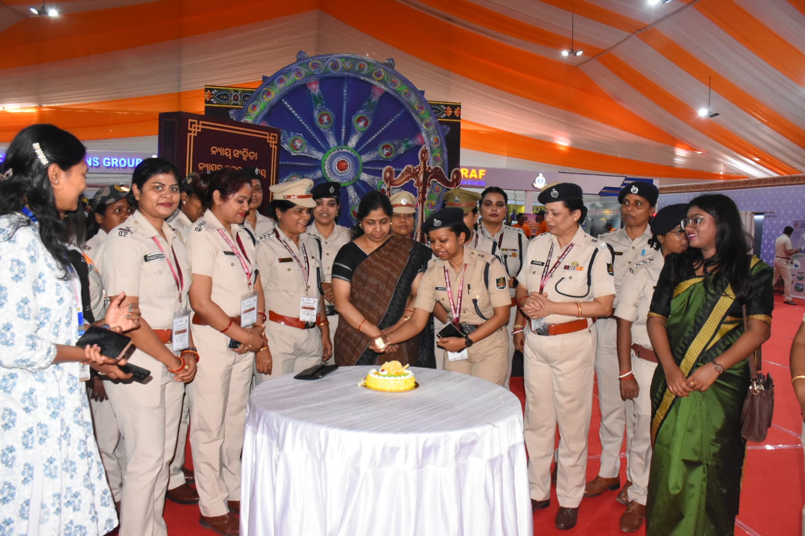 Women police personnel celebrate International Women’s Day at Nayapalli police stall set up at Exhibition Ground in Bhubaneswar