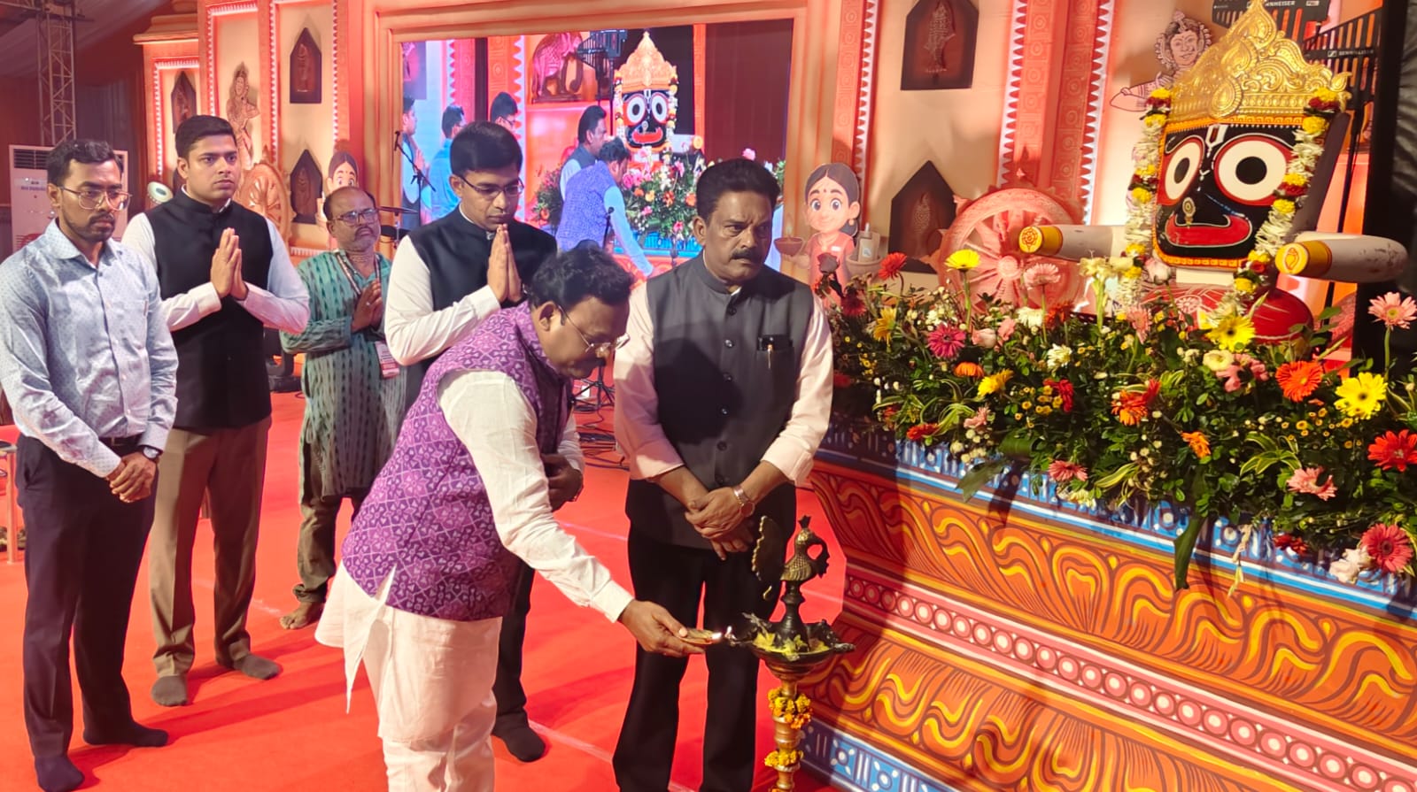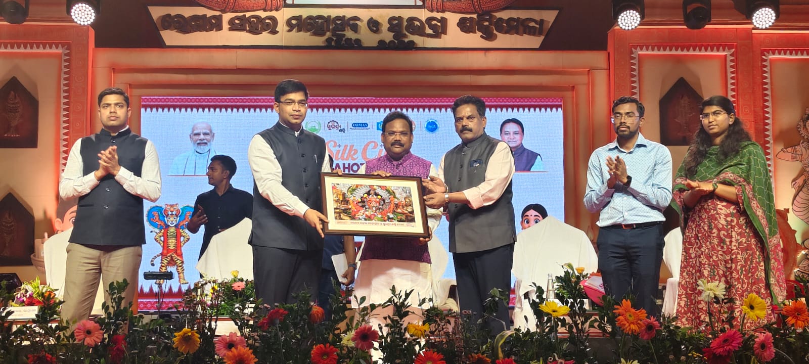 Minister Gokulananda Mallik and other dignitaries on stage during the fourth day of the Subhadra Shakti Mela at Khallikote College playground in Berhampur