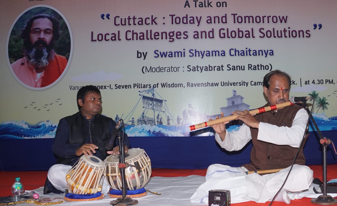 Guru Ratnakar Tripathy plays flute at a function organised at Ravenshaw University in Cuttack