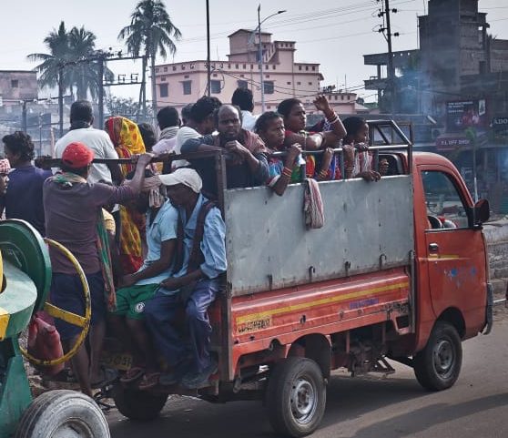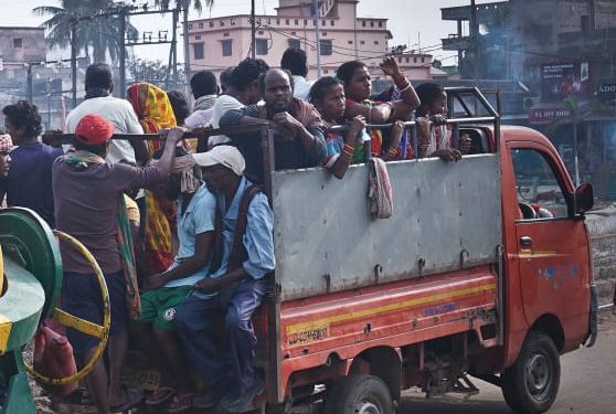 Rising lives, daily wage earners travel on a vehicle near Ranihat in Cuttack