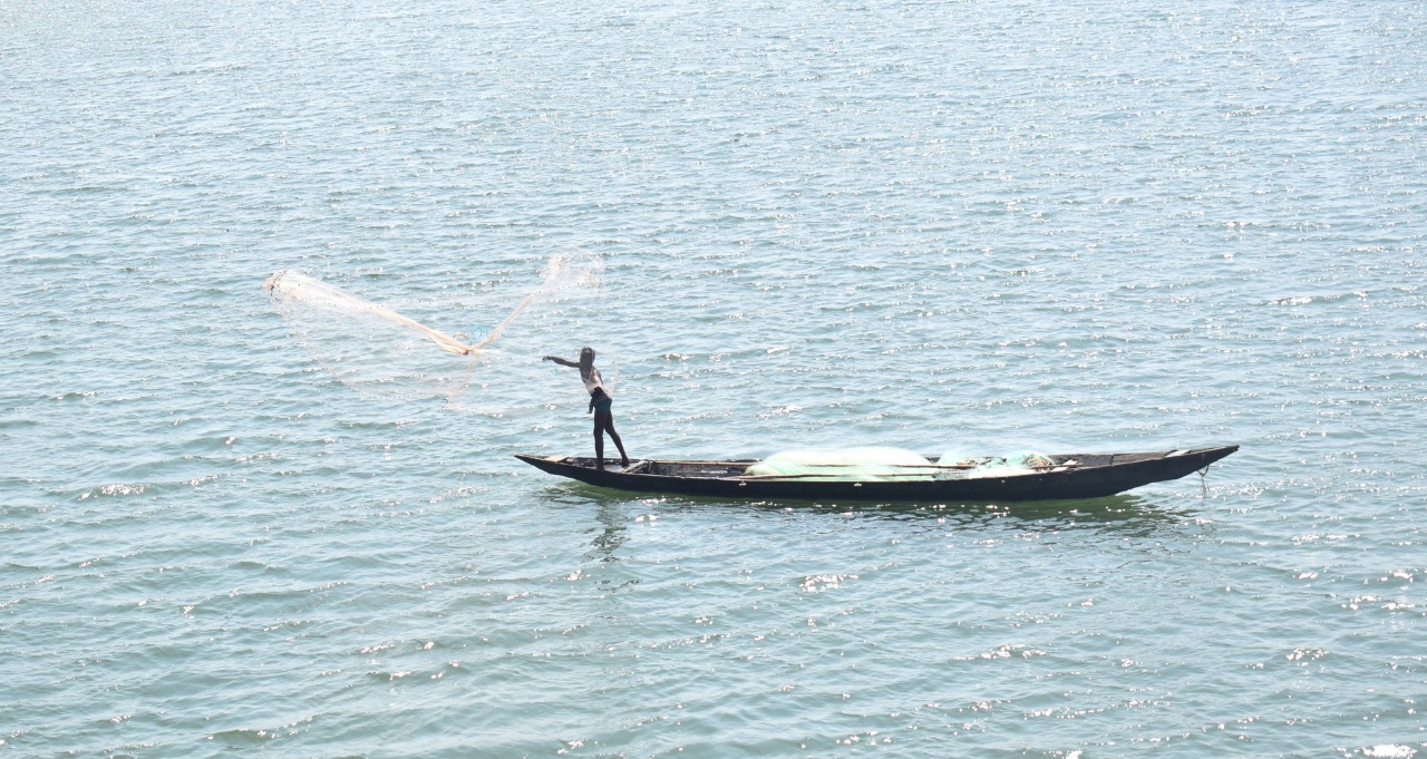 A man casts his fishing net into the Daya river on the outskirts of Bhubaneswar Tuesday afternoon