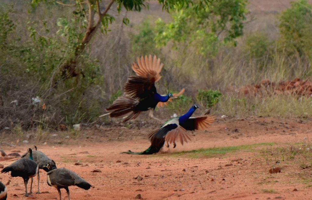 Peafowls feeding at Naraj on Bhubaneswar outskirts