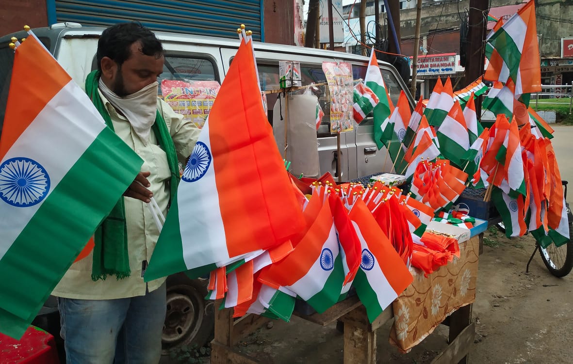 Man puts up National Flags for sale at Buxibazaar in Cuttack ahead of Independence Day