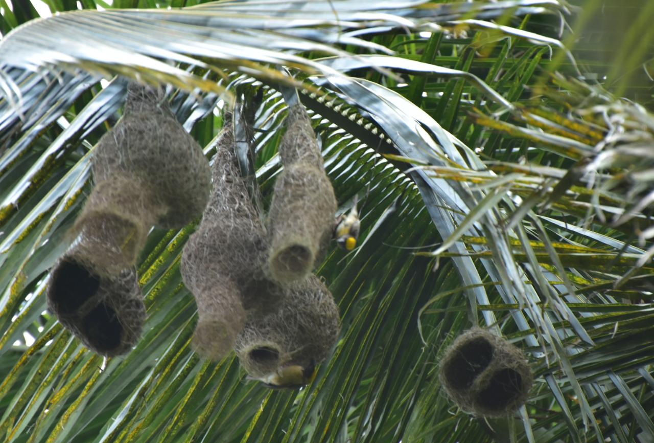Weaverbirds busy making nests on a coconut tree near Bhubaneswar