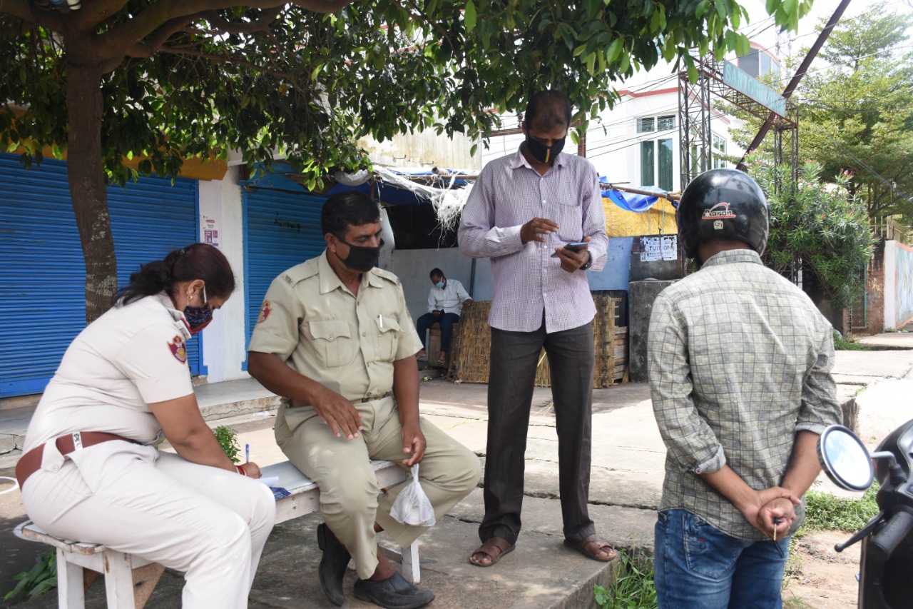 Police personnel collecting fines from violators commuting on cars and bikes during the weekend shutdown