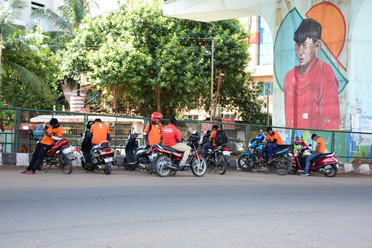 A group of food-delivery boys waiting for orders to get prepared for them to deliver to customers during the shutdown