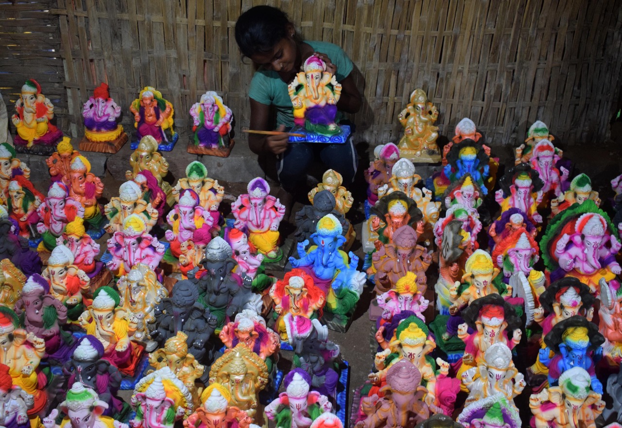A young girl giving final touches to a Ganesh statue before the Ganesh Puja