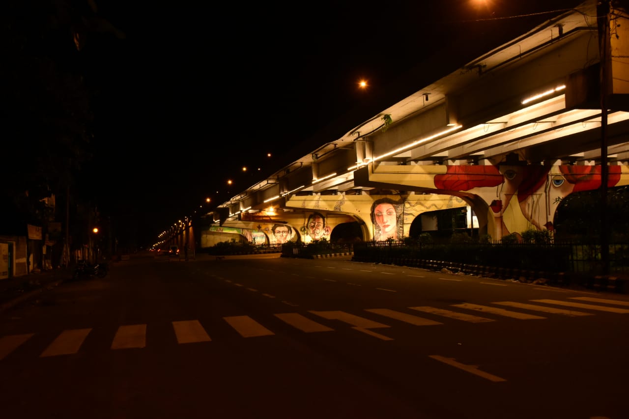 An illuminated Vani Vihar flyover lights up the adjoining deserted road during the night