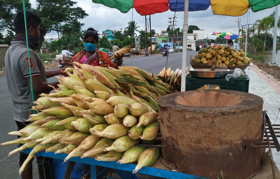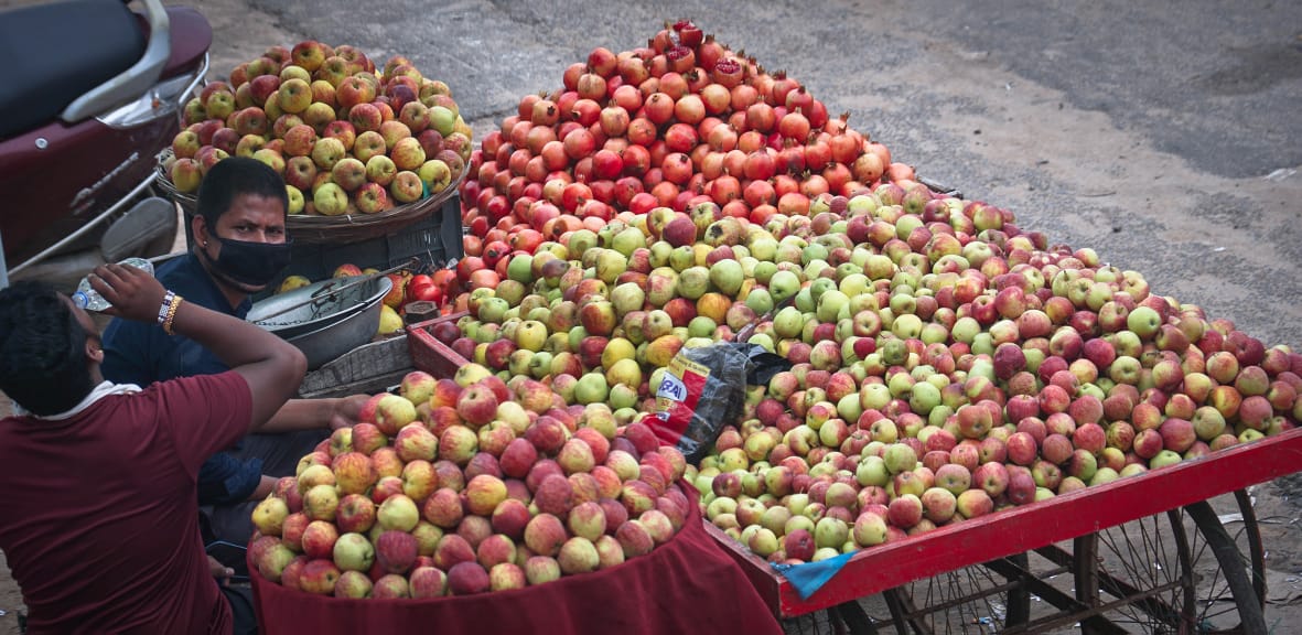 A fruit vendor and his associate patiently wait for customers near Link Road