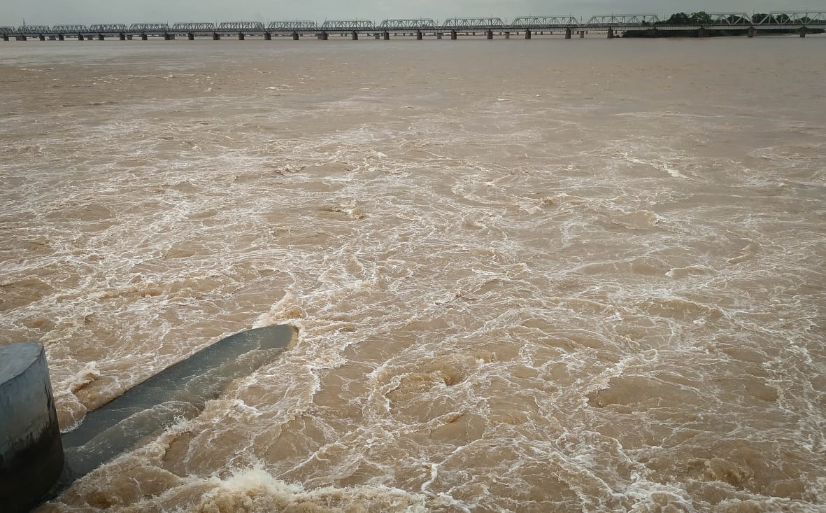 Floodwater from Mahanadi river flows near Jobra Anikat