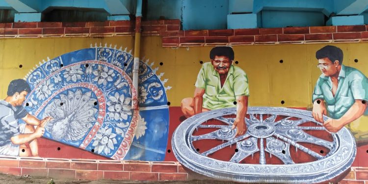 Artistes engage in paintings on Cuttack’s famous ‘Tarakasi’ work as part of a beautification drive at OMP over bridge