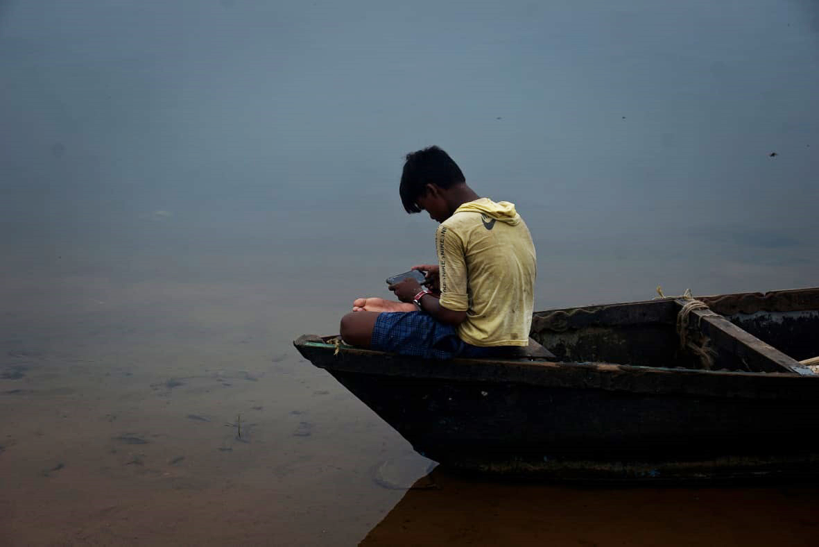 A kid plays game on mobile phone aboard a boat in Mahanadi at Cuttack’s Gadagadia ghat