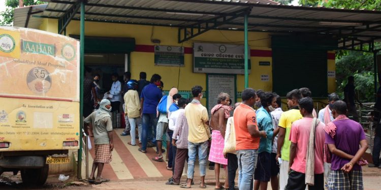 People queue up to get subsidised lunch at Capital Hospital Aahar centre in Bhubaneswar