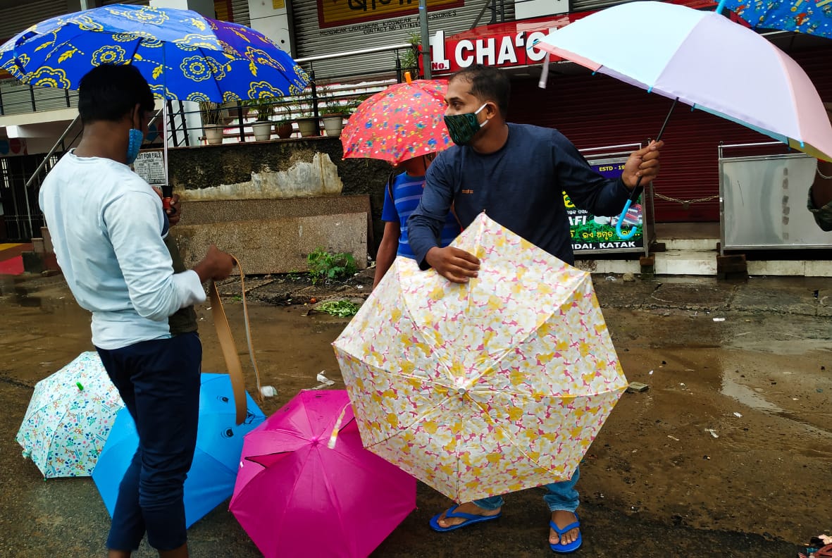With the onset of the Monsoon, customers buy colorful umbrellas displayed for sale alongside the main road at Cuttack