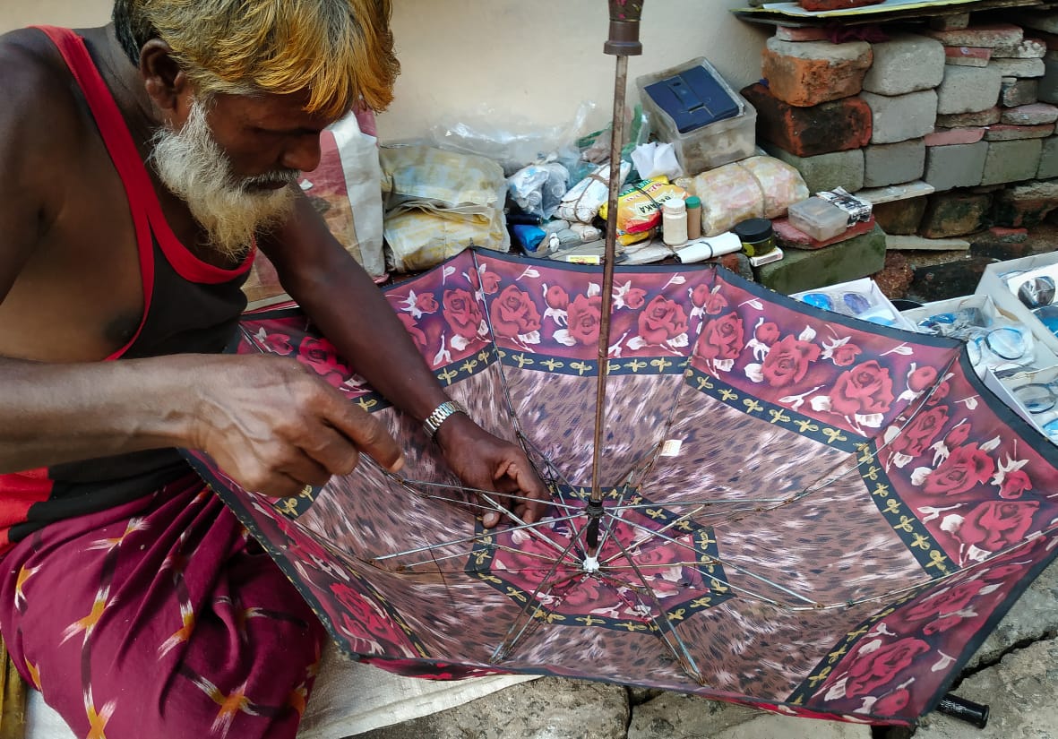 An umbrella repairman fixes a gamp at Cuttack’s Kacheri Square