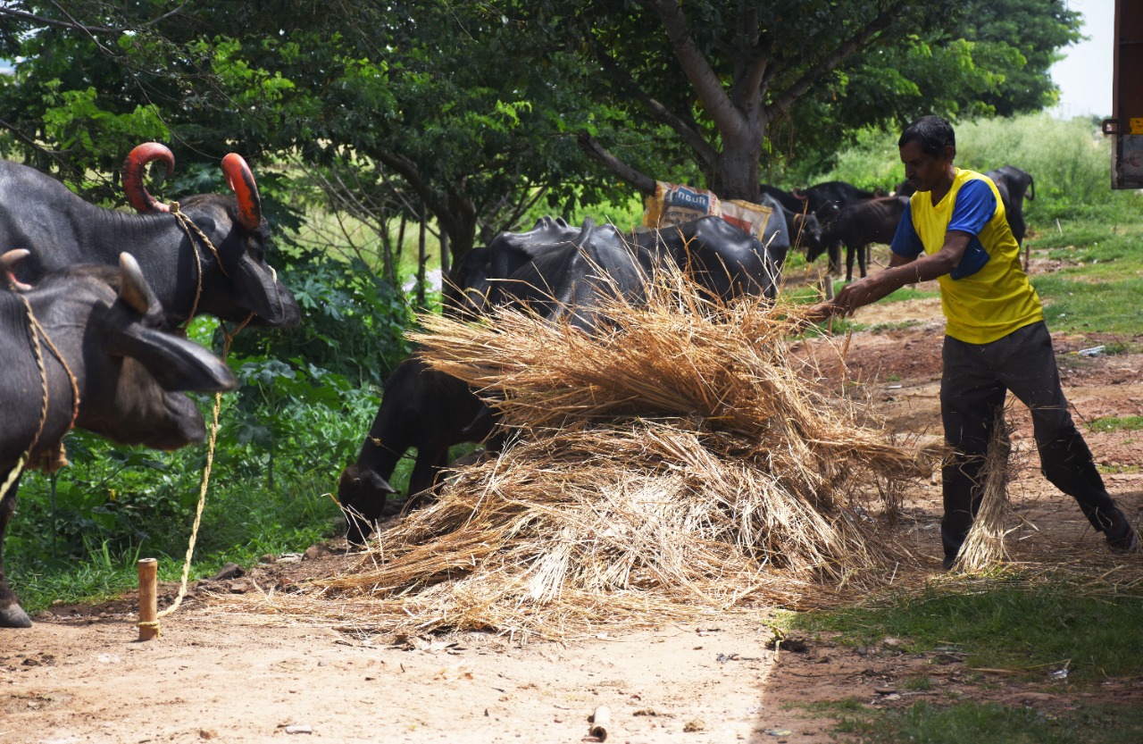 A man feeds his buffaloes on the Bhubaneswar-Cuttack bypass road