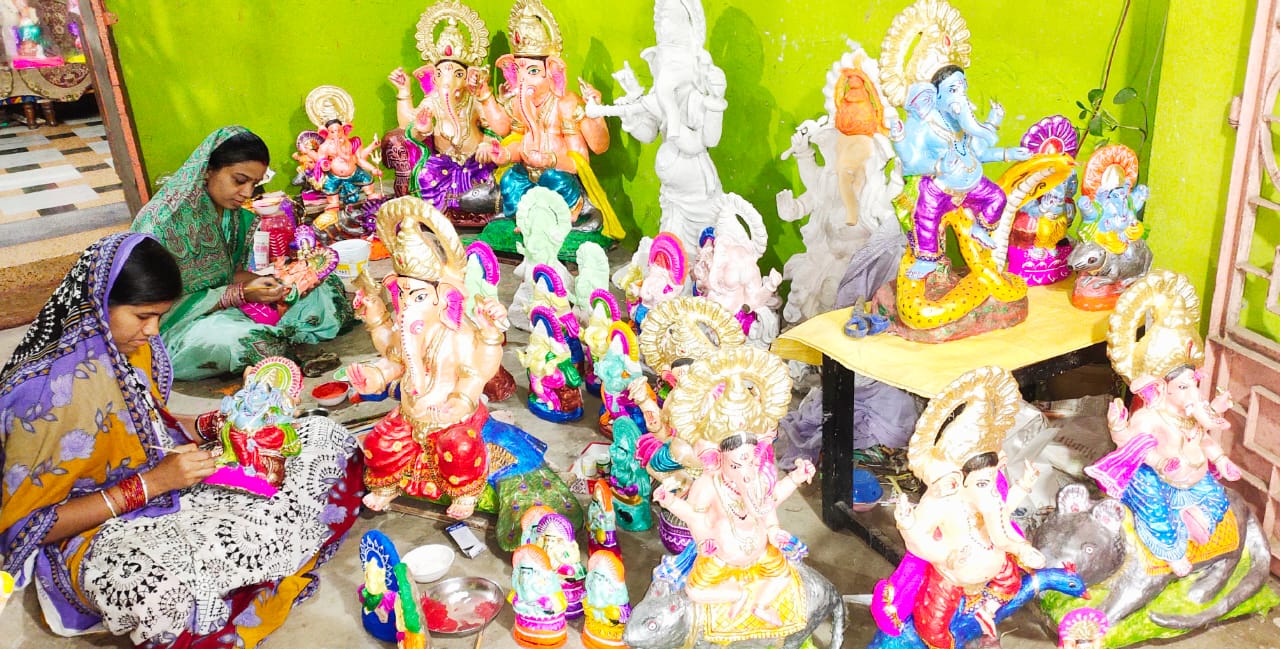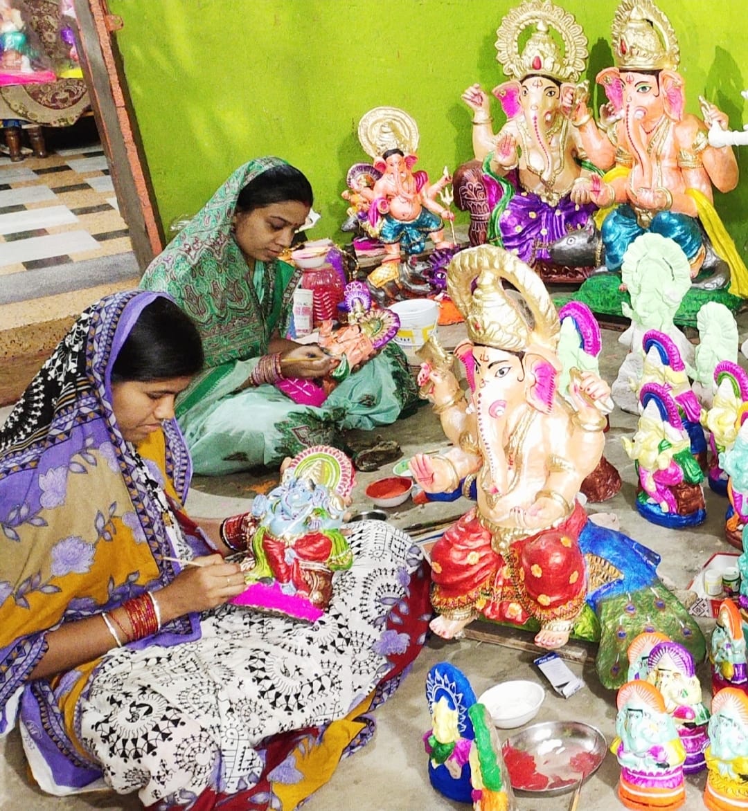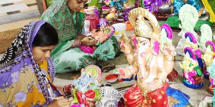 Women paint clay idols of Lord Ganesh at Ambapua area in Berhampur