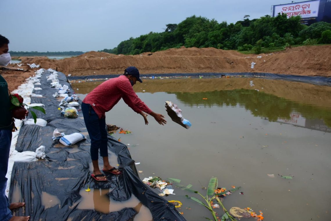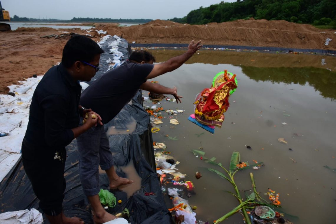 Clay idols of Lord Ganesh being immersed in a makeshift pond prepared by BMC near Kuakhai bridge in Bhubaneswar
