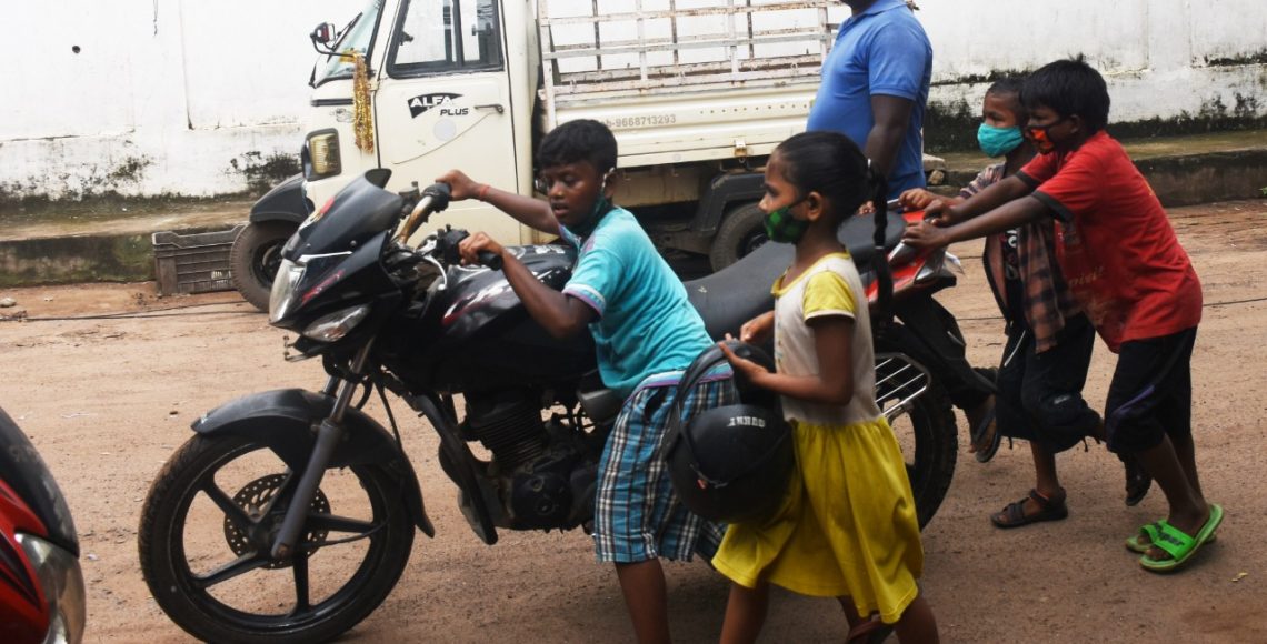 Children push a broken down two-wheeler at Kochilei Market in Bhubaneswar
