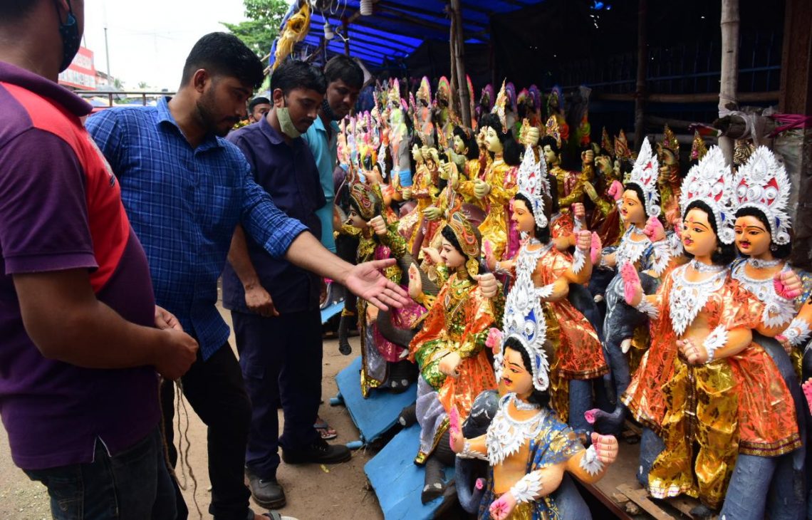 Customers line up to buy clay idols of Lord Vishwakarma in Bhubaneswar