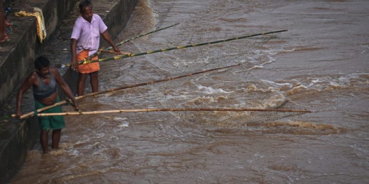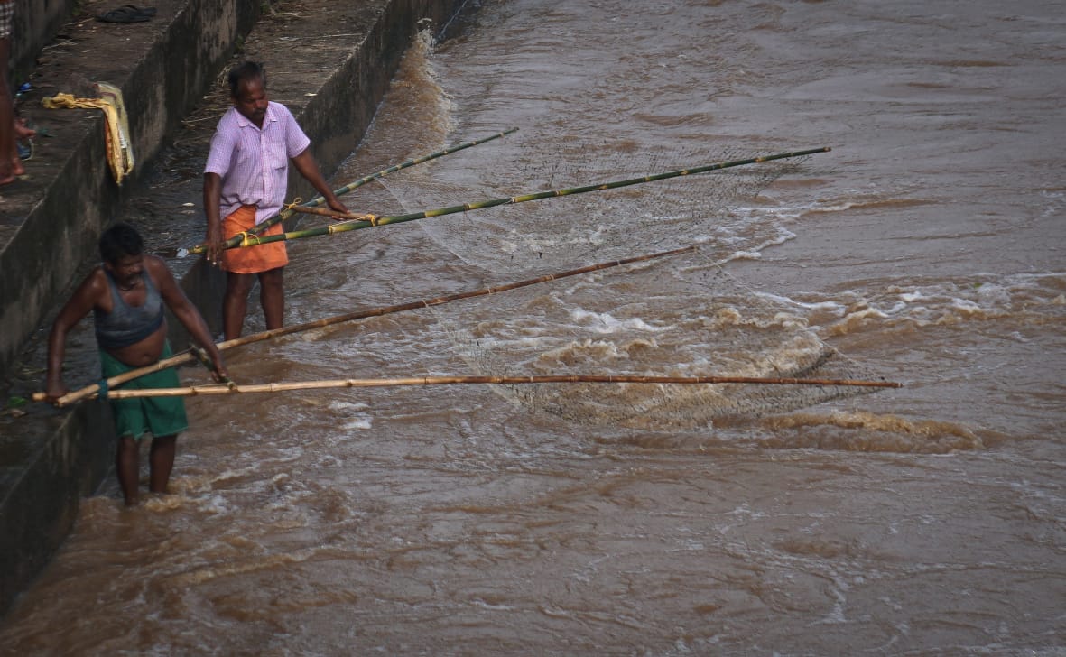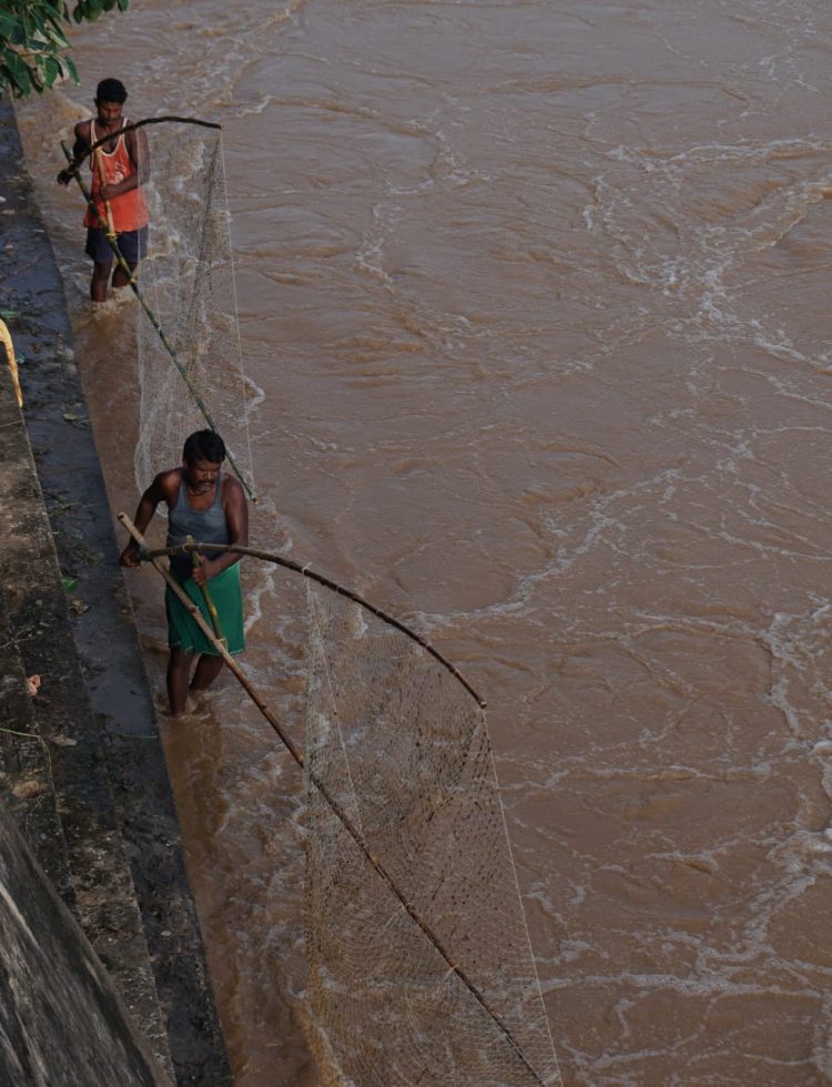 Fishermen busy fishing at Naraj anicut in Cuttack
