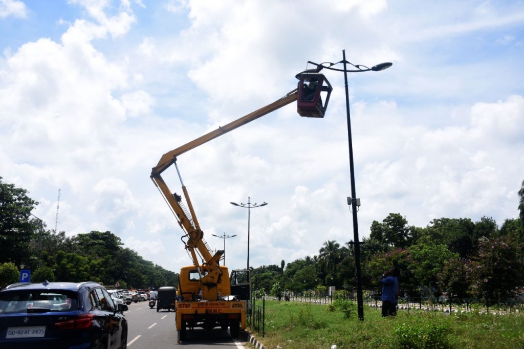 BMC workers repair a streetlight at Rajmahal Square in Bhubaneswar