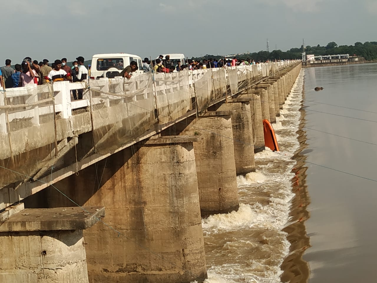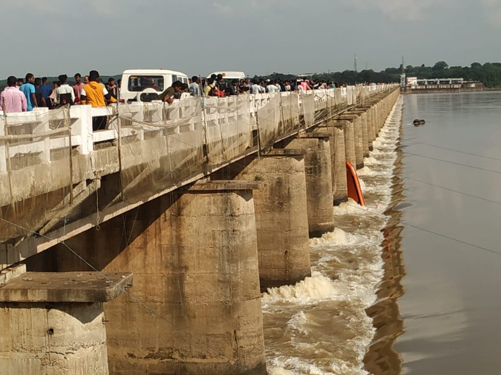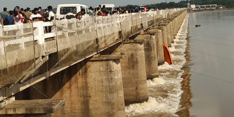 An inflatable boat of ODRAF sent to rescue a stuck elephant at Mundali Barrage in Cuttack lays overturned