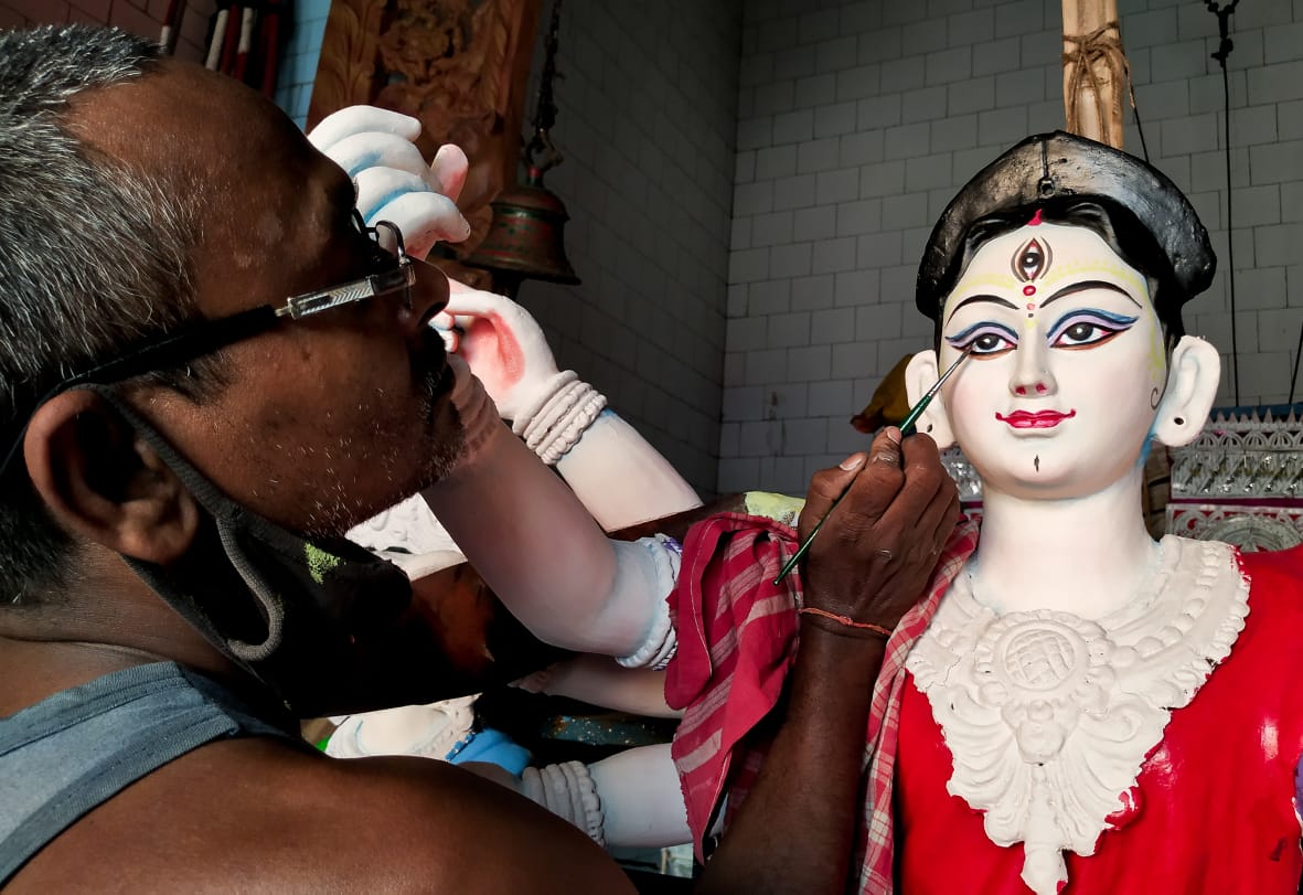 An artisan gives final touches to clay idol of Goddess Durga at Ranihat Puja Pandal in Cuttack