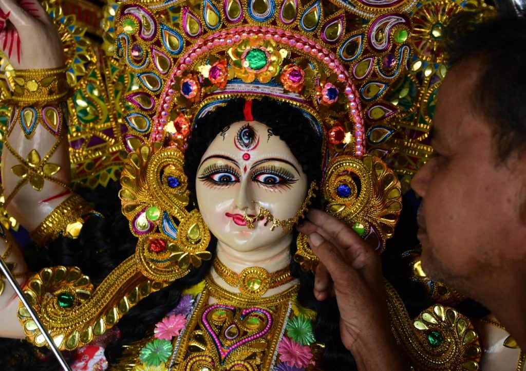 An artist gives final touches to clay idol of Goddess Durga at Rasulgarh puja pandal in Bhubaneswar