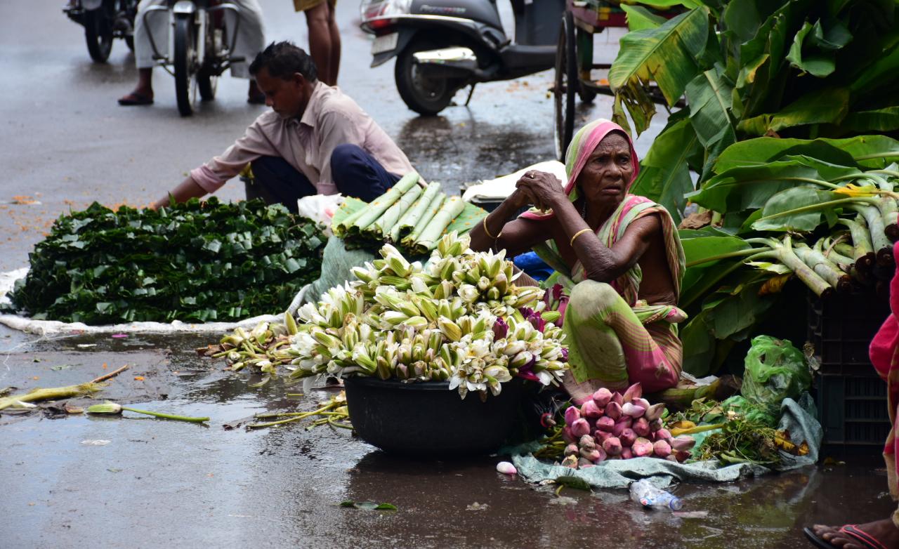 An elderly florist awaits customers at Unit-I market in Bhubaneswar