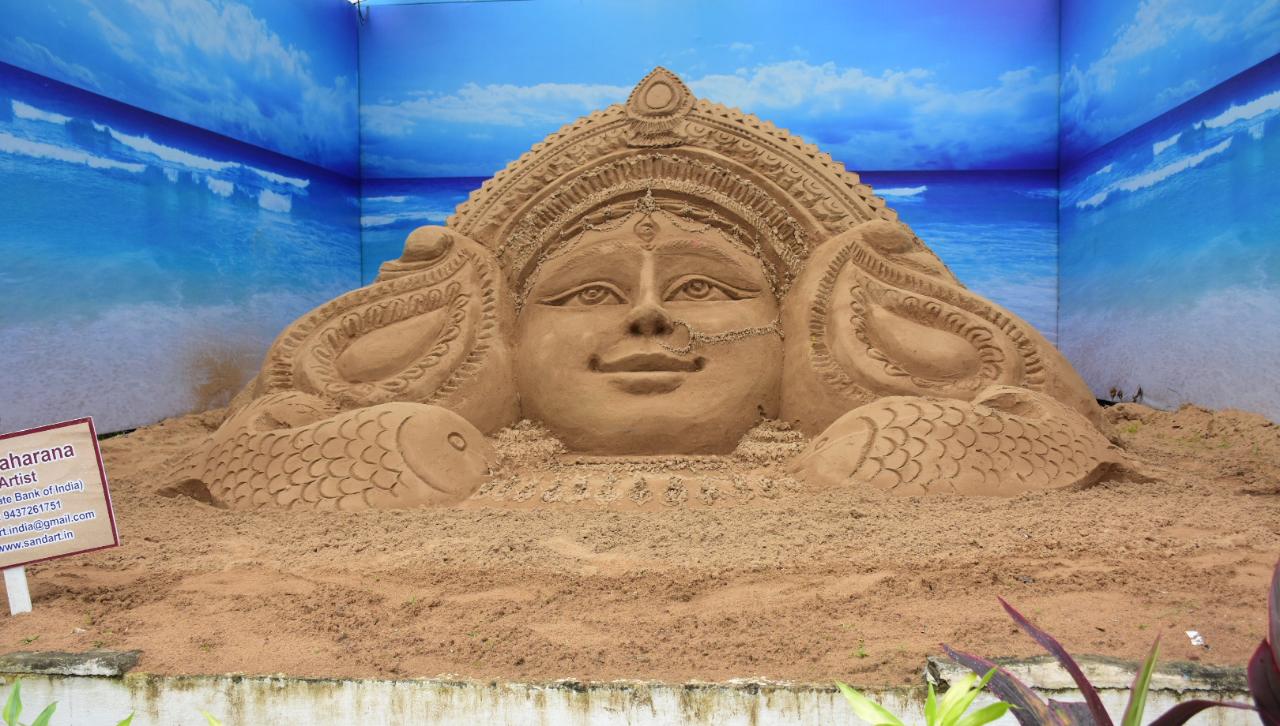 Sand artist Subala Maharana creates a sand art of Goddess Durga on Vijaya Dashami at Unit-I SBI office in Bhubaneswar