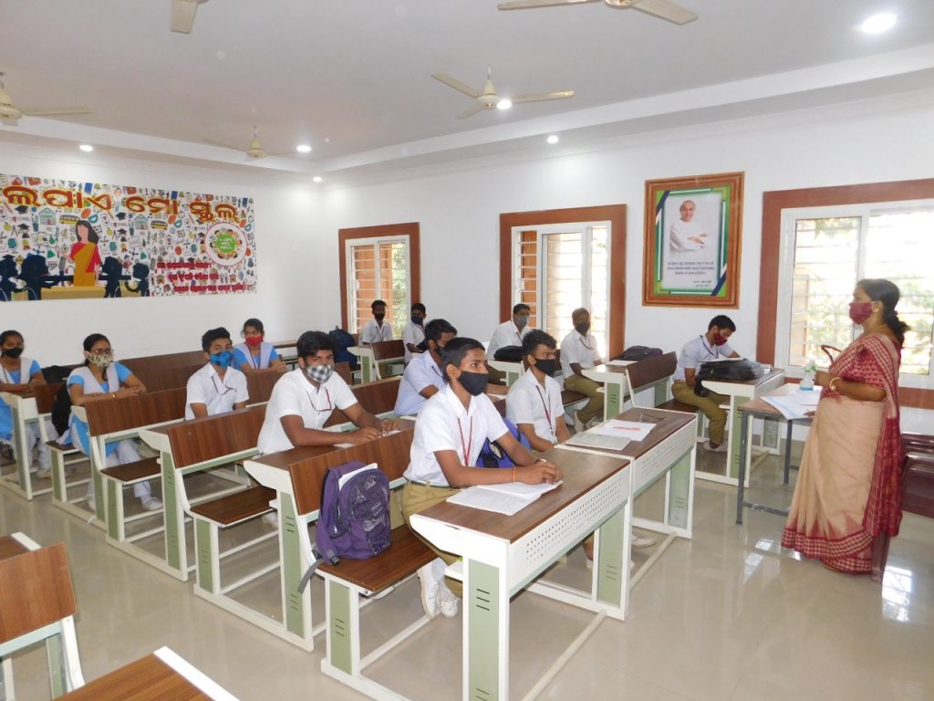 An official measures the temperature of students just before they enter the classroom at the Capital High School, Unit III in Bhubaneswar