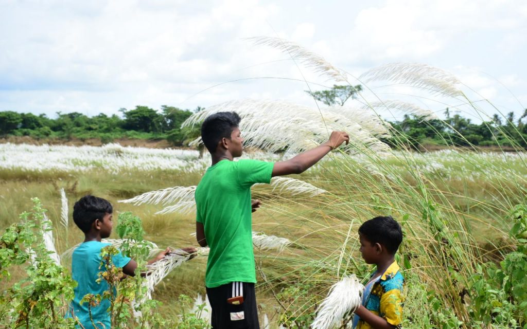 Children play near a kans grass field at Balikuda village on Bhubaneswar suburbs