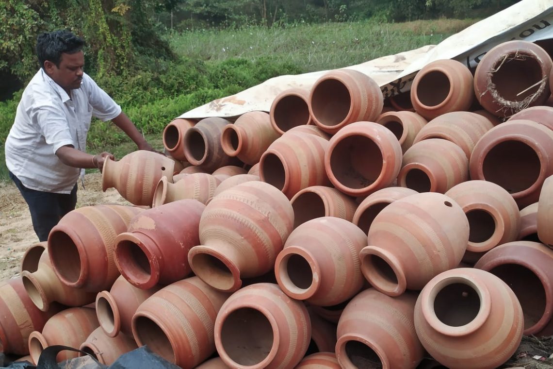 A street vendor puts terracotta pots on display at Gopalpur