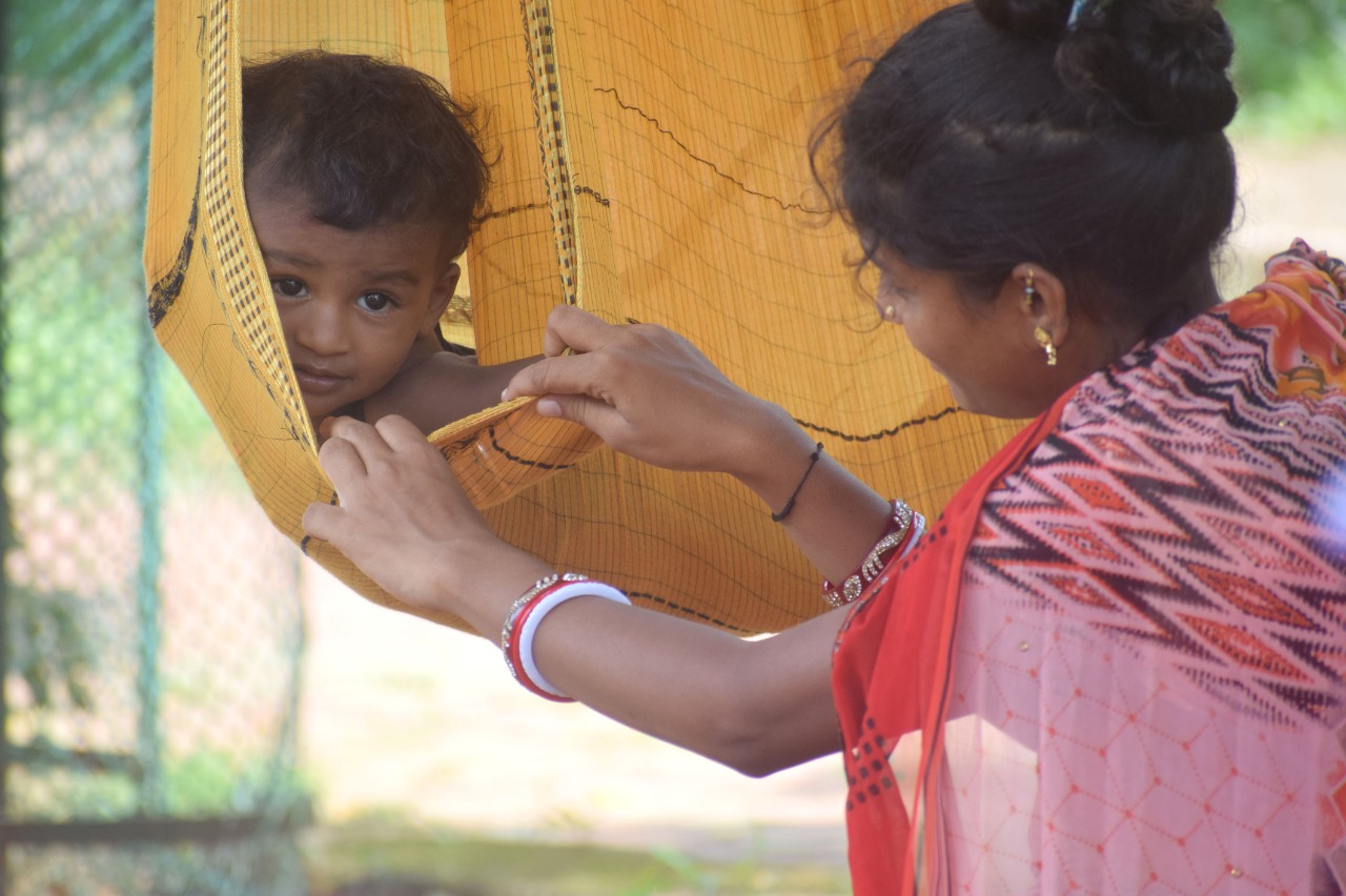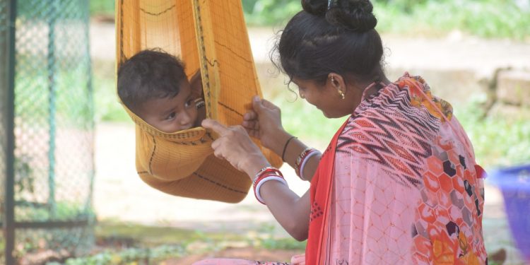 A woman street vendor plays with her child on Rajbhaban Road in Bhubaneswar