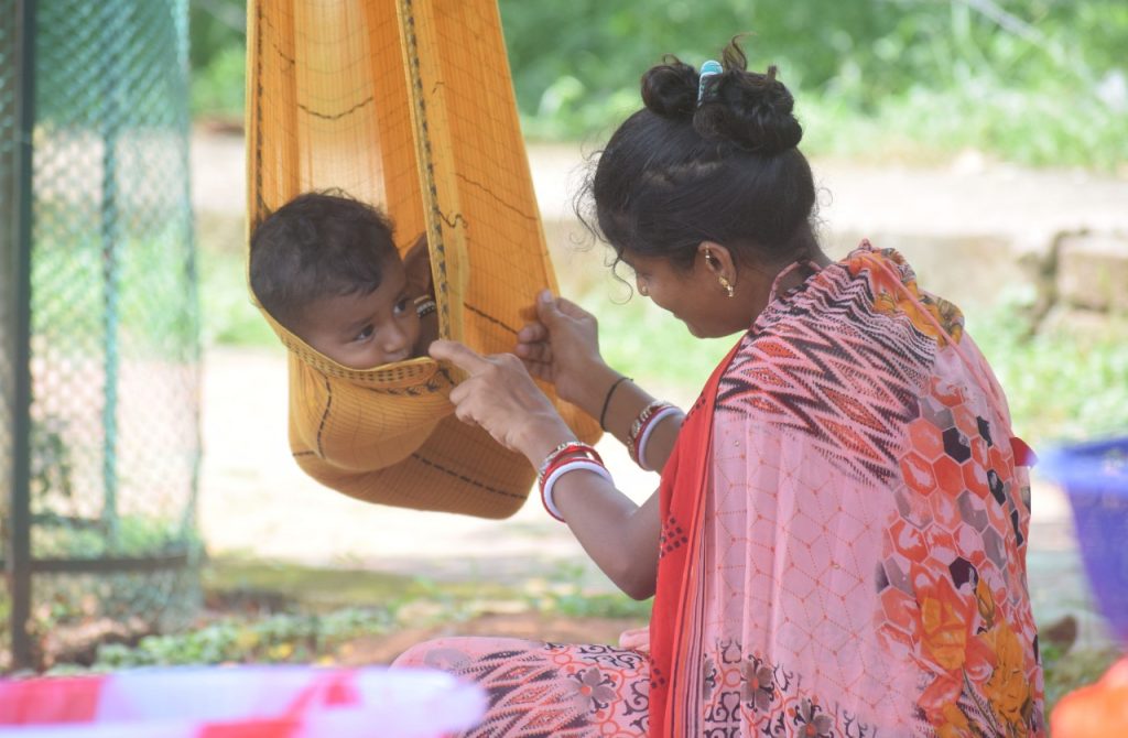 A woman street vendor plays with her child on Rajbhaban Road in Bhubaneswar