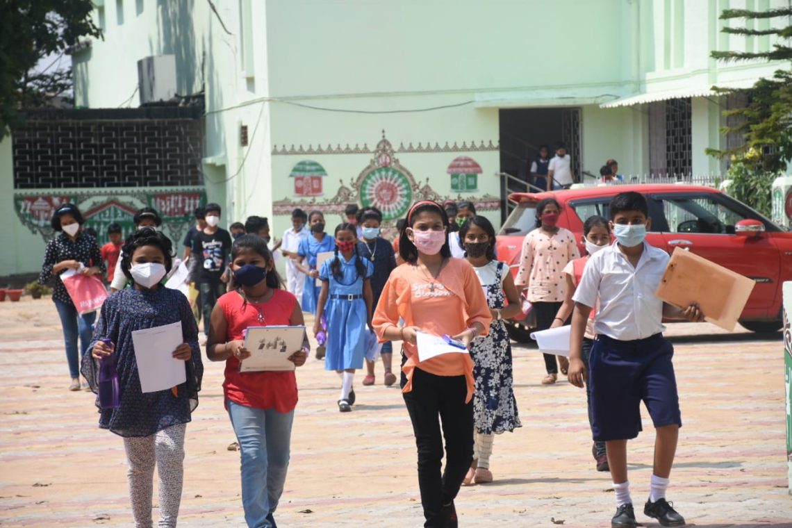 Children come out of Unit-I Govt High School in Bhubaneswar after appearing in Model School Entrance