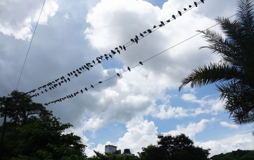 Pigeons rest on an electricity cable at AG Square in Bhubaneswar