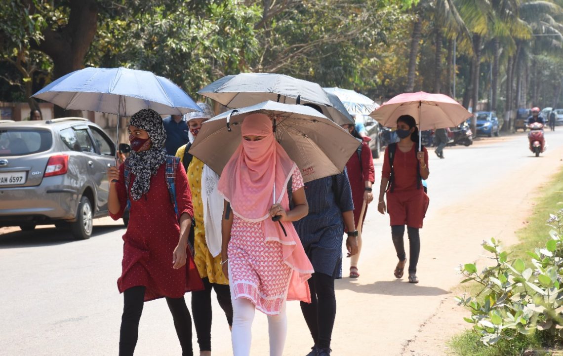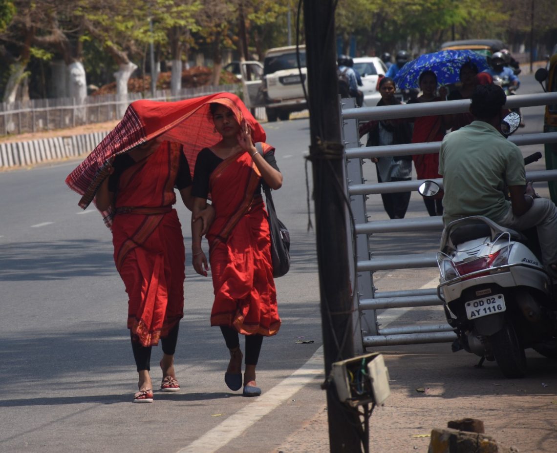 Students walk with umbrellas under hot sun in Bhubaneswar