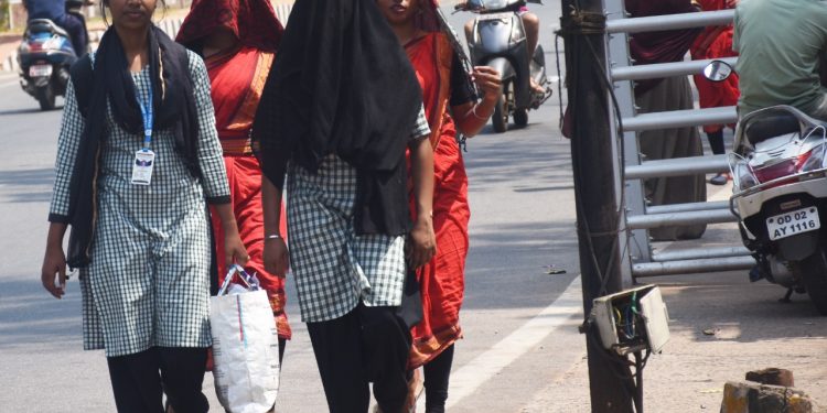 Girls cover their heads with a saree to protect themselves from heat in Bhubaneswar