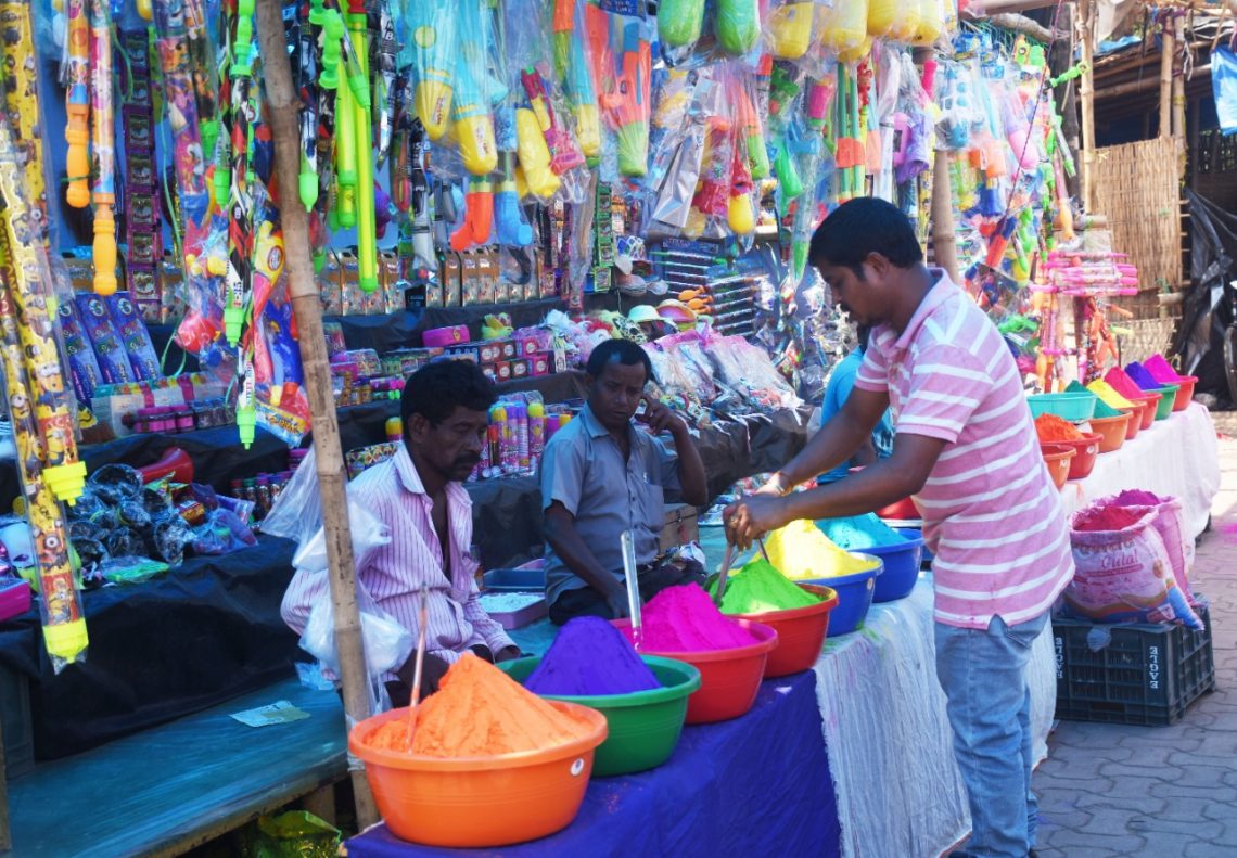 Shops displaying gulal, sprinklers and colours at the Unit-I market in Bhubaneswar