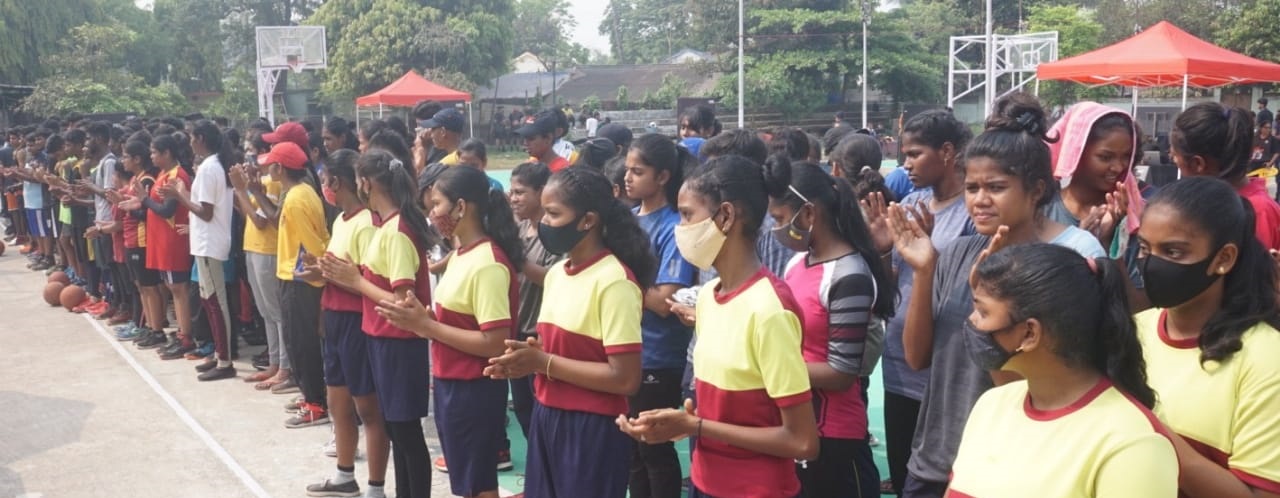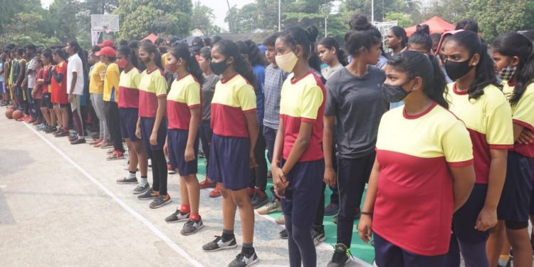 Participants taking part in the inaugural function of the state basketball championships line up at the Barabati Stadium in Cuttack