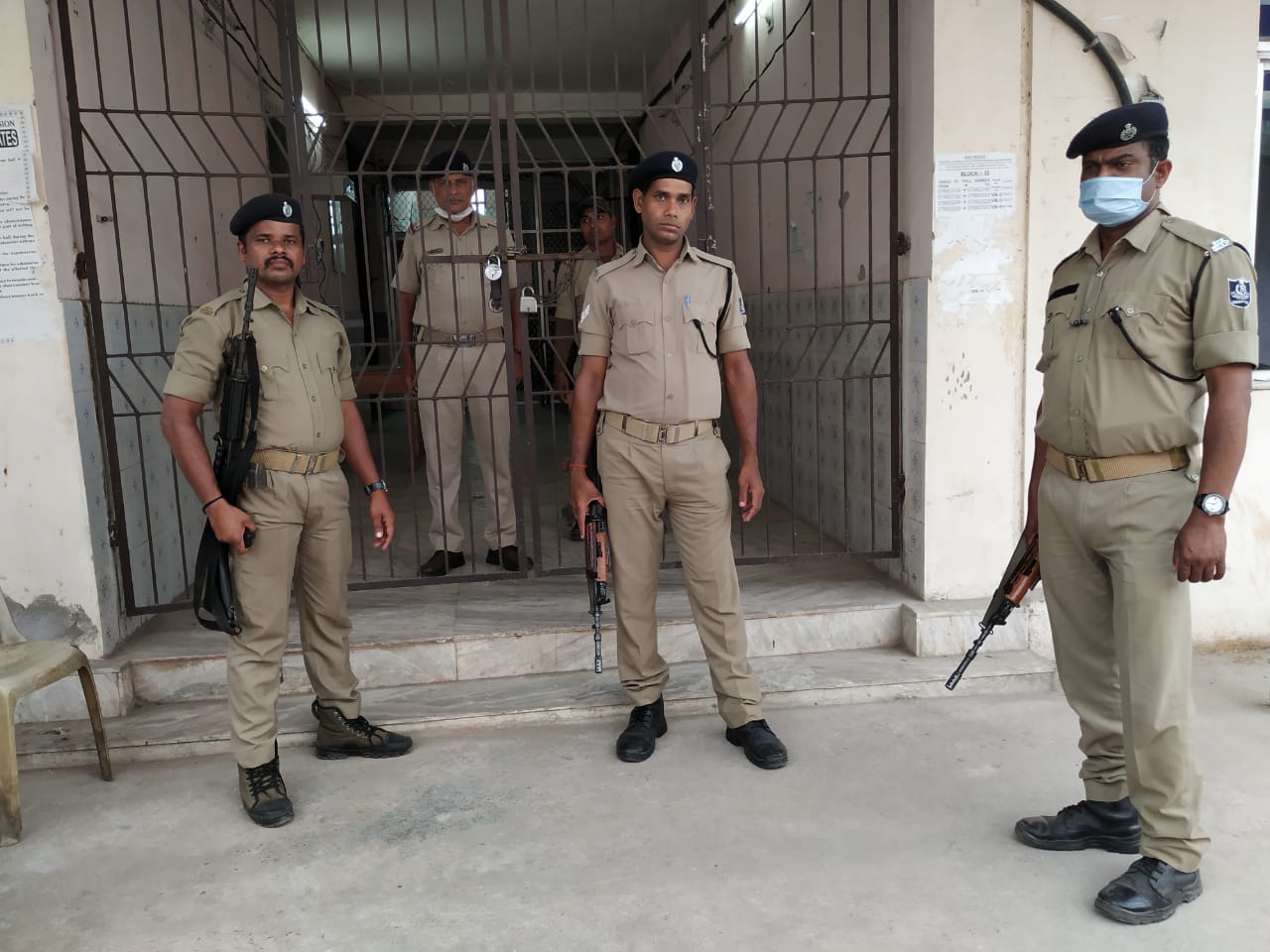 Policemen guard the strong room stored with EVMs for counting at the Bhubanananda Engineering School campus in Cuttack