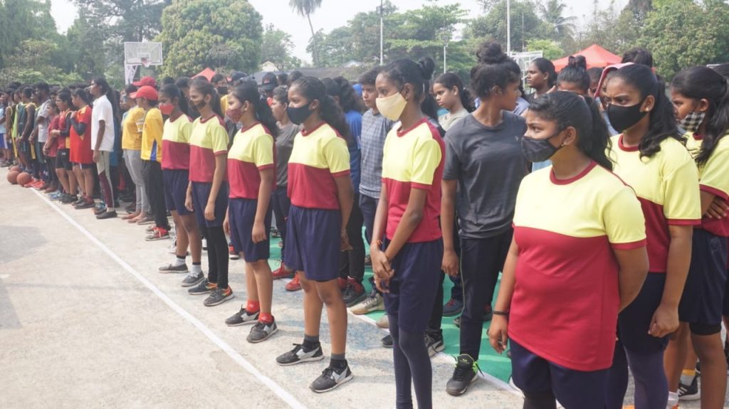Participants taking part in the inaugural function of the state basketball championships line up at the Barabati Stadium in Cuttack